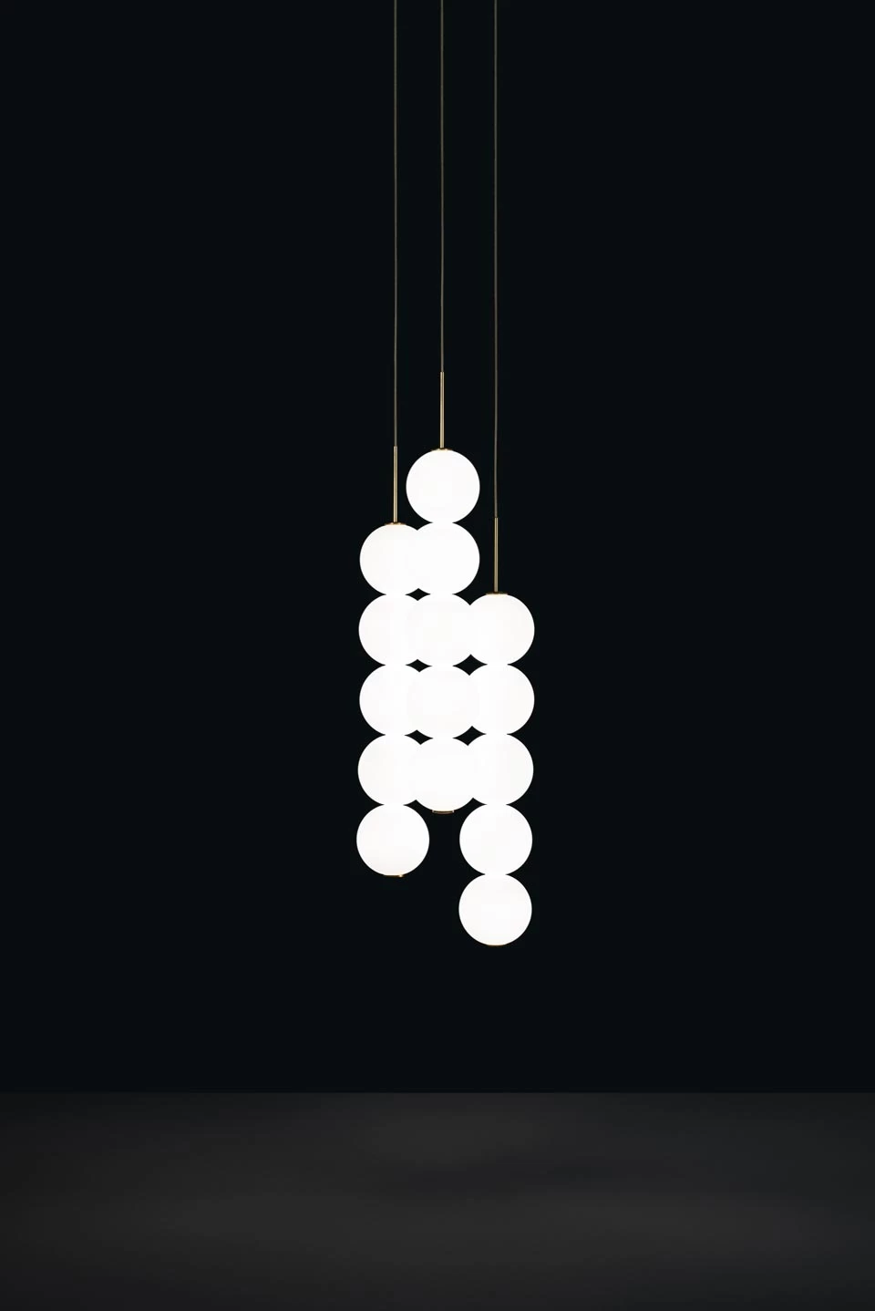 Les suspensions Abacus attirent le regard par leur design contemporain et épuré. La suspension est composée de 15 boules réparties sur 3 câbles métalliques fins, assemblées comme sur un boulier et surmontées d’ une tige en laiton satiné. Les bulles sont en verre opale soufflé bouche selon les techniques artisanales traditionnelles. Les assemblages de boules en verre sont reliés à un support de plafond hexagonale par un câble en tissu champagne et sont équipés d’un éclairage LED intégré. Un support de plafond en laiton satiné est disponible en option, nous consulter.