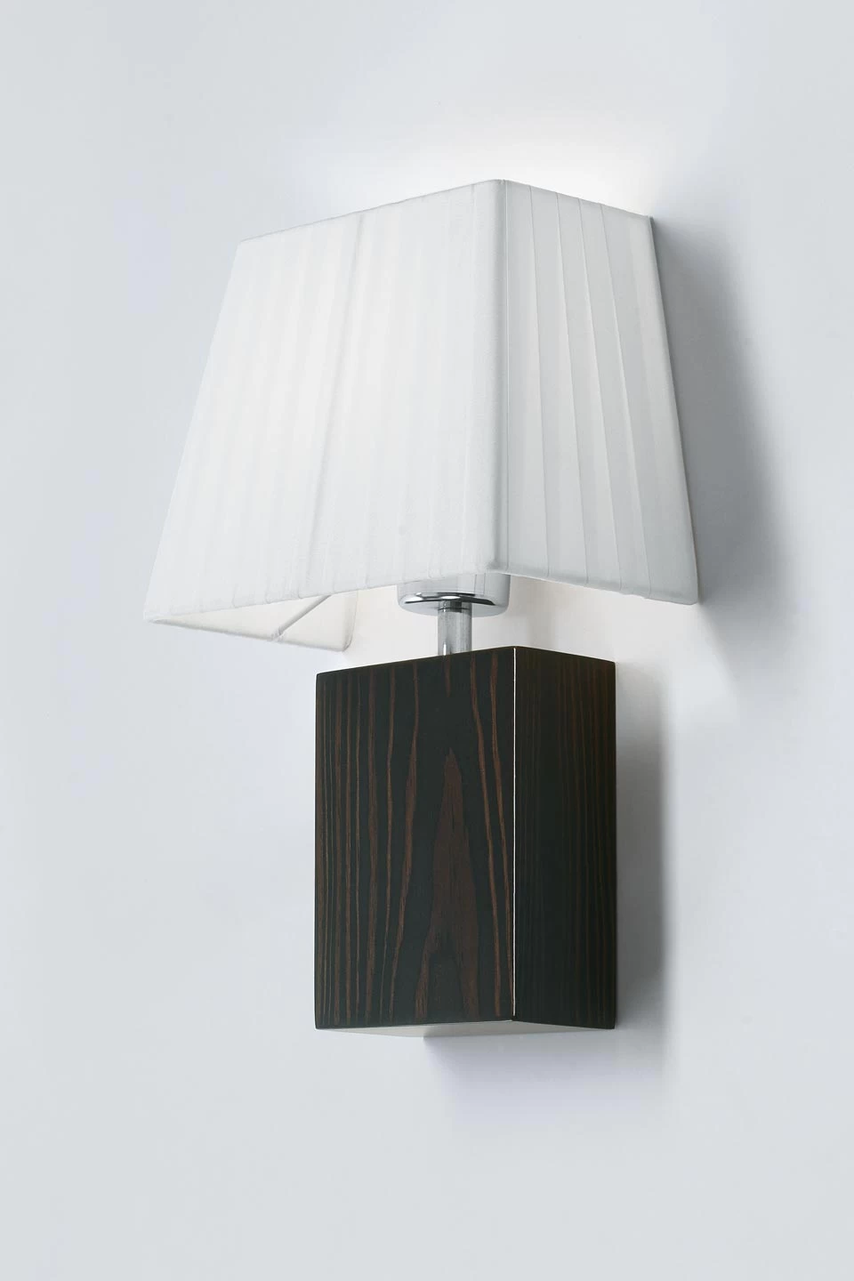 L’applique murale qui figure sur cette page est issue de la collection Smooth Wengué. Comme le nom de la ligne l’indique, la base de l’applique est en bois exotique wengué, aux reflets cuivrés. Un demi abat-jour en tissu plissé blanc couvre l’ampoule dont le support est en métal chromé. D’un design classique et sobre, elle conviendra pour l’éclairage et la décoration d’une chambre à coucher. La maison Paulo Coelho se distingue par des abat-jour d’une grand valeur esthétique et des collections très complètes déclinées en lampes, lampadaires, appliques et suspensions. La collection Smooth Wengué comprend également une petite lampe visible sous la référence 16060815, une grande lampe sous la référence 16060816 et un lampadaire référence 16060817.