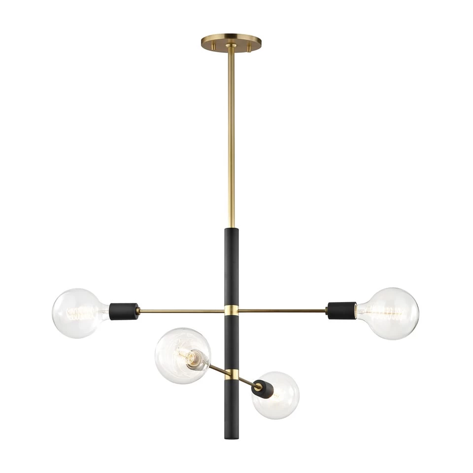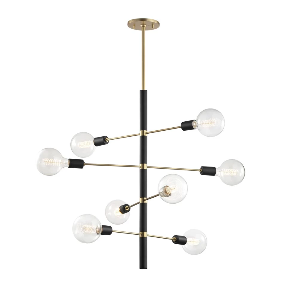 Moderne et épurée, Astrid est une lustre très contemporain. Avec ses 8 lumières, il est composée d’un tige verticale fixée au plafond sur un support rond, jalonnée de bras horizontaux qui traversent la tige principale, et équipés d’ampoules à chaque extrémité, organisés de façon asymétrique. Notez la finition peinte en noir de la tige et des douilles, créant une délicieuse alternance de noir et or. Hudson Valley, qui rassemble plusieurs maison américaines en une, développe une gamme de luminaire qui puise son inspiration dans une grande variété de style et d’époque, avec une attention particulière à la qualité de ses produits.