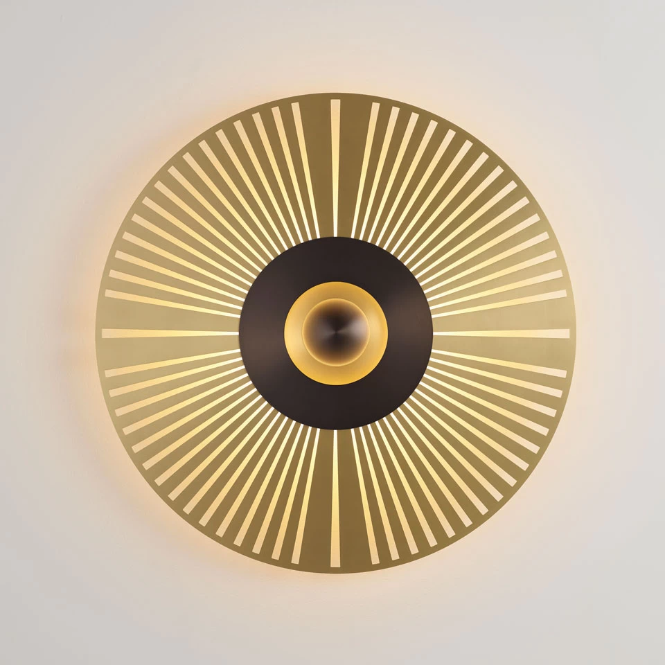 Laissez-vous charmer par la dimension solaire et la touche Art Déco de l’applique Éclat issue de la collection contemporaine Atmos, avec son disque doré en laiton massif, son jeu de superposition des finitions des différentes parties de l’applique, et son éclairage LED intégré. Le modèle est composé d’un disque de laiton massif finition satinée, percé de rayons qui se rejoignent autour d’une platine finition graphite satinée, avec un anneau doré et enfin un médaillon central finition graphite satinée. Le motif géométrique des rayons n’est pas sans rappeler une certaine esthétique Art Déco, et le modèle amène une lumière chaleureuse à votre intérieur. La maison française CVL fondée en 1960 affirme un parti design et contemporain depuis les années 90 avec des luminaires remarquables par la qualité des matériaux utilisés, en particulier le laiton massif, et la finesse de leur dessin. Tous les luminaires sont fabriqués à la main au sein des ateliers situés en Pays de la Loire, pour une production 100% française, s’inscrivant dans une démarche environnementale vertueuse.