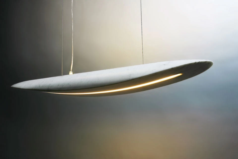 S’inspirant du tableau la bataille d’Argone en évoquant à la fois la lune et les nuages, la suspension Aura Magritte en marbre de Carrare semble flotter dans les airs. Elle est faite dans un bloc de marbre et accueille deux éclairages LED, haut et bas qui forme un halo de lumière autour d’elle. Elle est retenue par deux câbles fins de suspension et le fil d’alimentation électrique est transparent et discret. Aura Magritte est une création du designer Stefano Rubertelli pour Matlight.