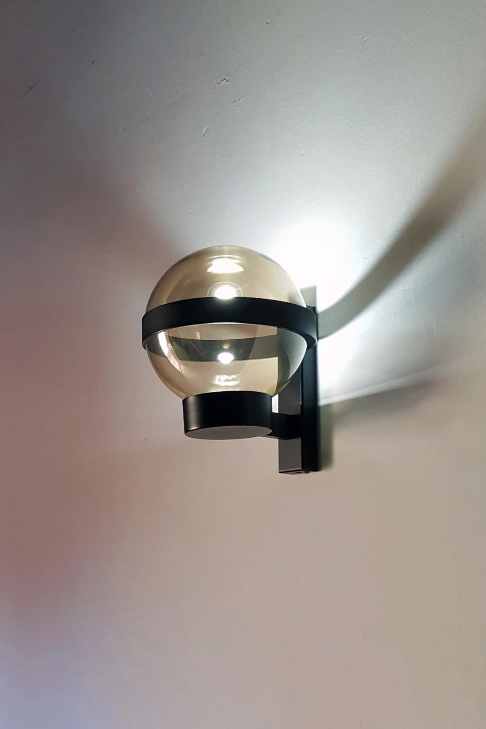 Inspirée d’un classique des entrées d’immeubles résidentiels barcelonais des années 60 et 70, Barcino est une applique composée d’une boule de verre, fumé pour ce modèle, enchâssée dans une structure métallique noire faite d’une section carrée verticale, un anneau qui cercle le diffuseur, et un support cylindrique équipé d’un module COB LED intégré qui permet de produire une lumière homogène et indirecte. La maison espagnole Luz Difusion en activité depuis 1985 développe une collection qui mélange design industriel, rétro et minimaliste, avec une attention particulière pour la qualité des matériaux, essentiellement le verre et le métal.