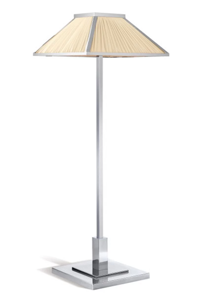Cette liseuse Beverly est réalisée en métal chromé. Elle est munie d’un abat-jour aux arêtes métalliques, également chromées, et tendu de soie ivoire. Le socle est constitué de trois éléments principaux, deux carrés concentriques surmontés d’un bloc rectangulaire. Il existe une lampe de table assortie, visible sous la référence 13090444, ainsi qu’une applique (13090424) et une suspension (13090465).