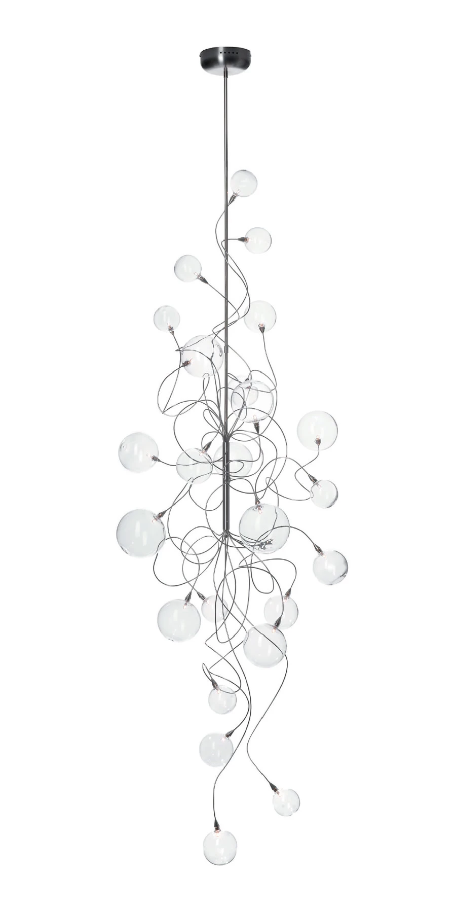La suspension Bubbles Long 24 lumières est très étonnante avec ses 24 boules en verre qui s’allongent sur 2mètres d’un enchevêtrement de fil d’acier. La gamme Bubbles et Bubbles Long est une gamme en fil d’acier de 3mm, avec des bulles de verre, verreries sphériques, clipsées sur le fil, hébergeant de petites ampoules G4. Les bulles font 14cm de diamètre. Les fils d’acier peuvent se tordre et se positionner individuellement. Chaque pièce est faite à la main, et signée individuellement de son designer Harco Loor.