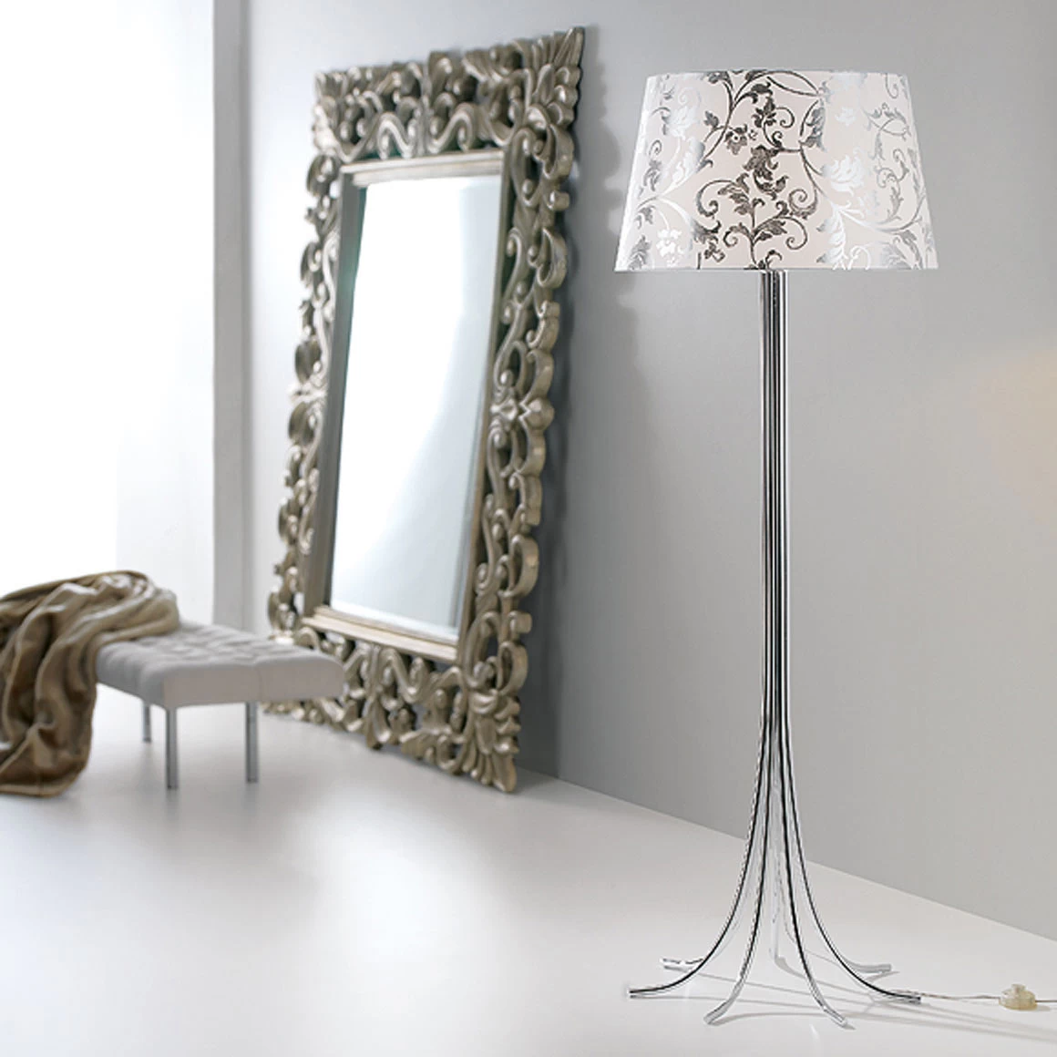 Ce lampadaire en fer chromé, dont l’abat jour est recouvert de motifs argentés fait partie de la collection Camber Cromado. D’un design aérien, les luminaires de la gamme Camber Cromado s’intègrent parfaitement dans des univers classiques ou contemporains, notamment de tonalités gris pâle ou blanc. Les arabesques argentées imprimées sur le tissu donnent majesté à ces luminaires en fer chromé aux lignes modernes. La gamme Camber Cromado se compose: d’une applique simple, d’une applique double, d’une applique triple, de deux plafonniers, d’un lustre, de deux lampes et d’un lampadaire.
