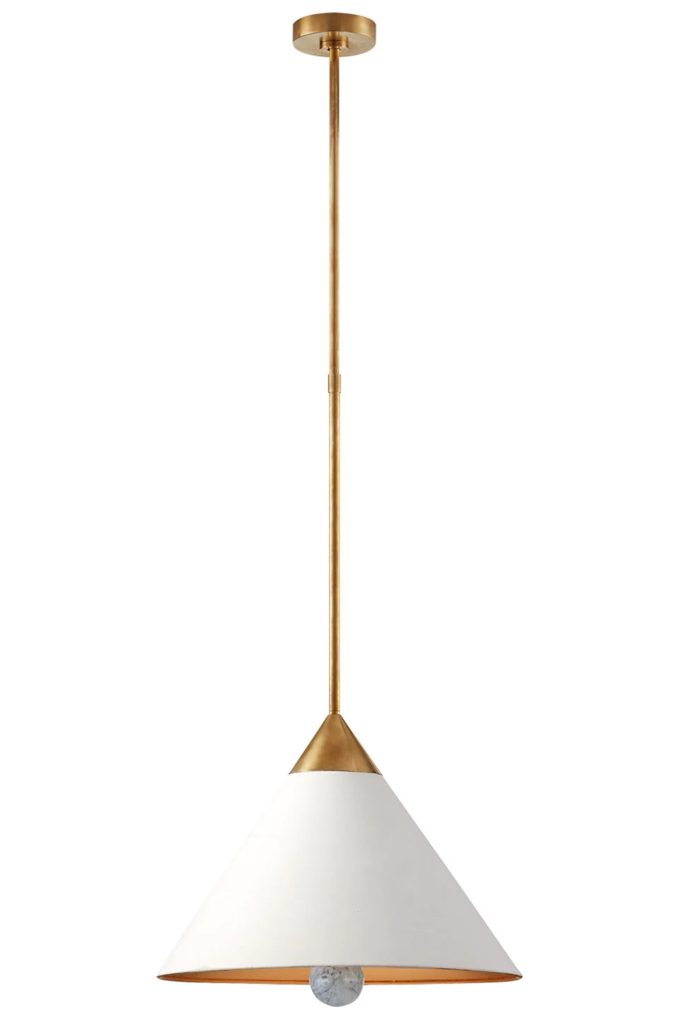 Une suspension moderne et minimaliste à la silhouette géométrique accrocheuse, la suspension Cléo 50cm est dotée d’un abat-jour conique blanc et or. Le modèle se compose d’un support de plafond rond doré, d’une tige de suspension, et d’un abat-jour aux belles proportions, un cône en feuille de métal blanc mat à la pointe dorée en laiton antique bruni, tout comme la tige et le support. Remarquez l’intérieur de l’abat-jour lui aussi doré, afin de garantir une lumière chaleureuse, ou encore la petite bille blanche qui dépasse très légèrement de la jupe de l’abat-jour. Ce luminaire est une création de la célèbre designer américaine Kelly Wearstler qui collabore avec la marque depuis de nombreuses années.