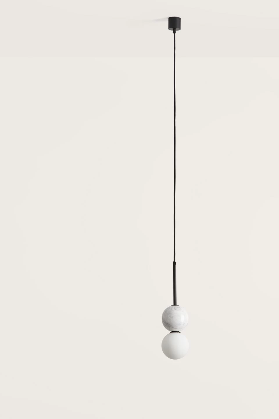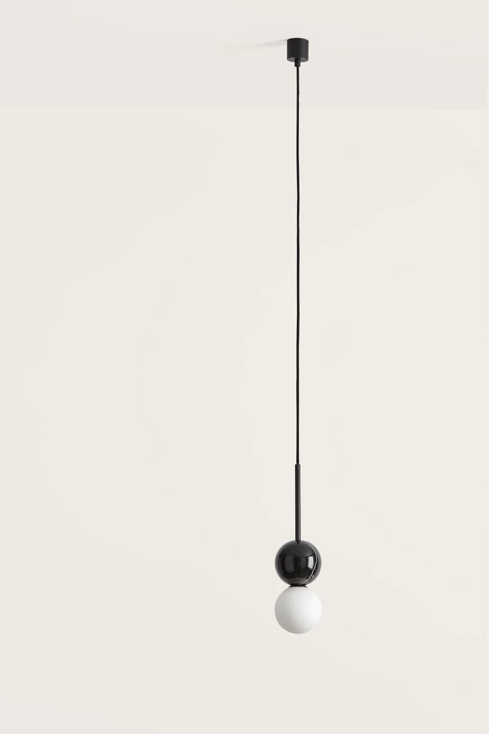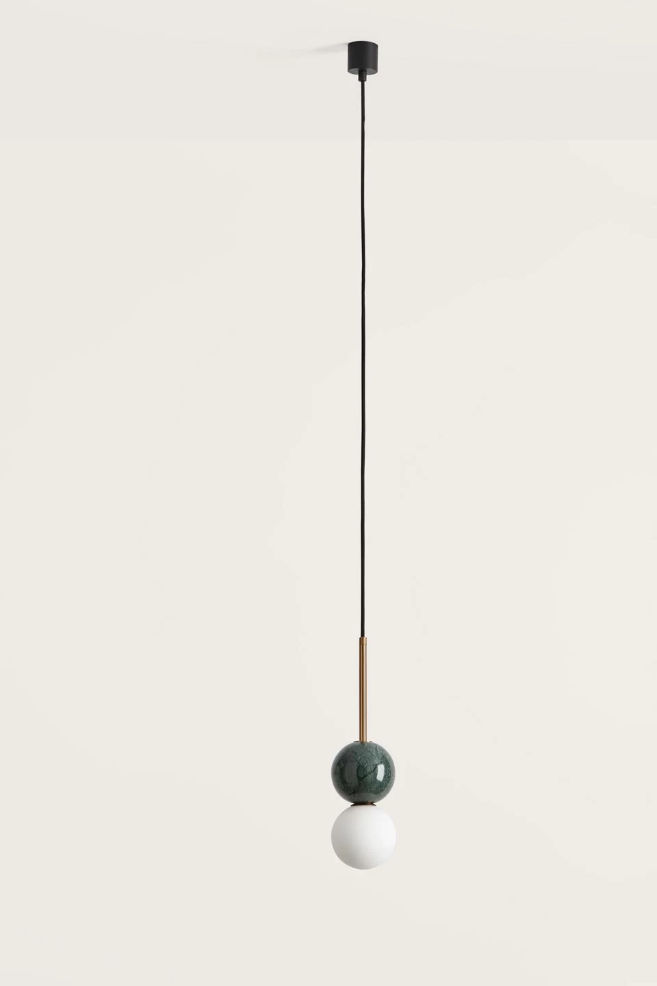Une ligne élégante, un design contemporain minimaliste, c’est la suspension Dalt, déclinée en différentes couleurs, dotée d’un diffuseur en boule de verre opale équipée d’une ampoule LED, surmontée d’une seconde boule de marbre vert. Admirez les volutes que forme le veinage aléatoire du marbre qui est vert pour ce modèle, donnant une dimension minérale unique à la suspension, qui est reliée à son piton cylindrique d’acier noir mat par un câble d’alimentation noir gainé sur la première partie d’un tube doré qui met le vert du marbre en valeur. La maison espagnole Aromas, fondée à Valence dans les années 1980, produit d’élégants et intemporels luminaires dans un style contemporain affirmé, tout en travaillant à partir de matériaux et techniques traditionnels, tel le marbre, la céramique ou le bois.