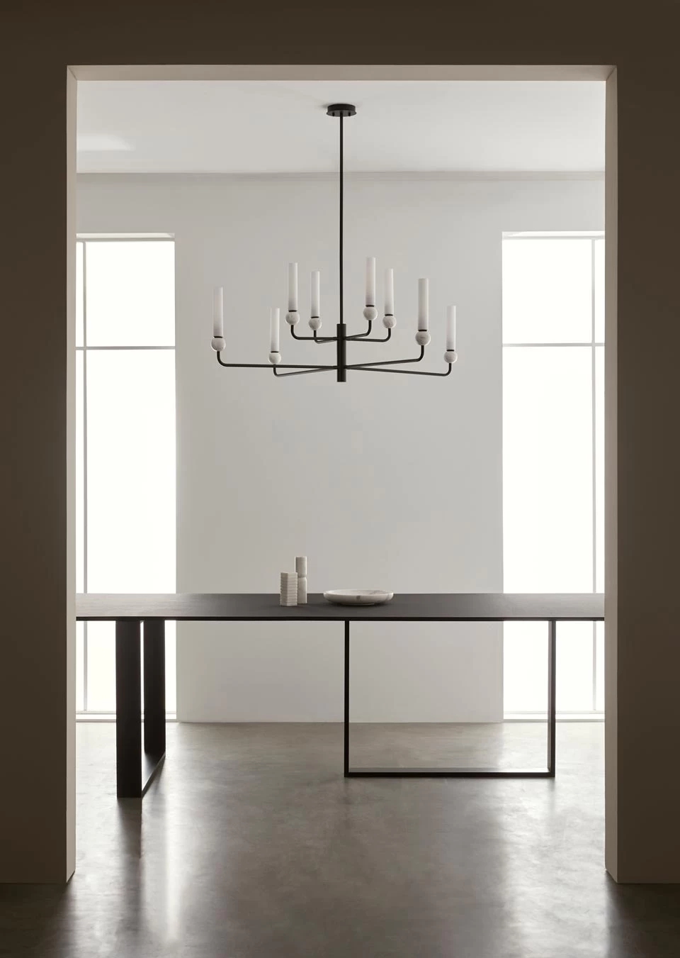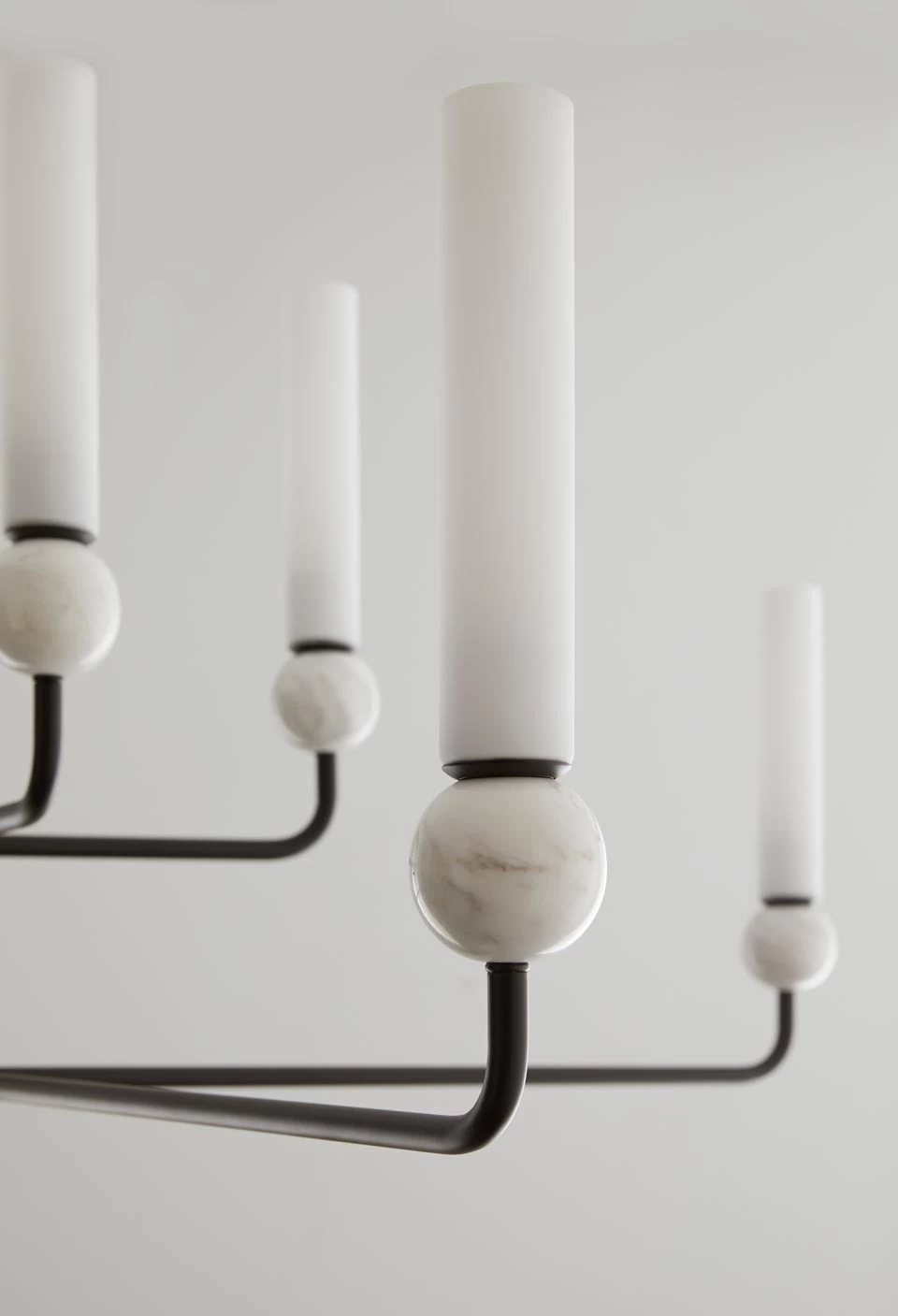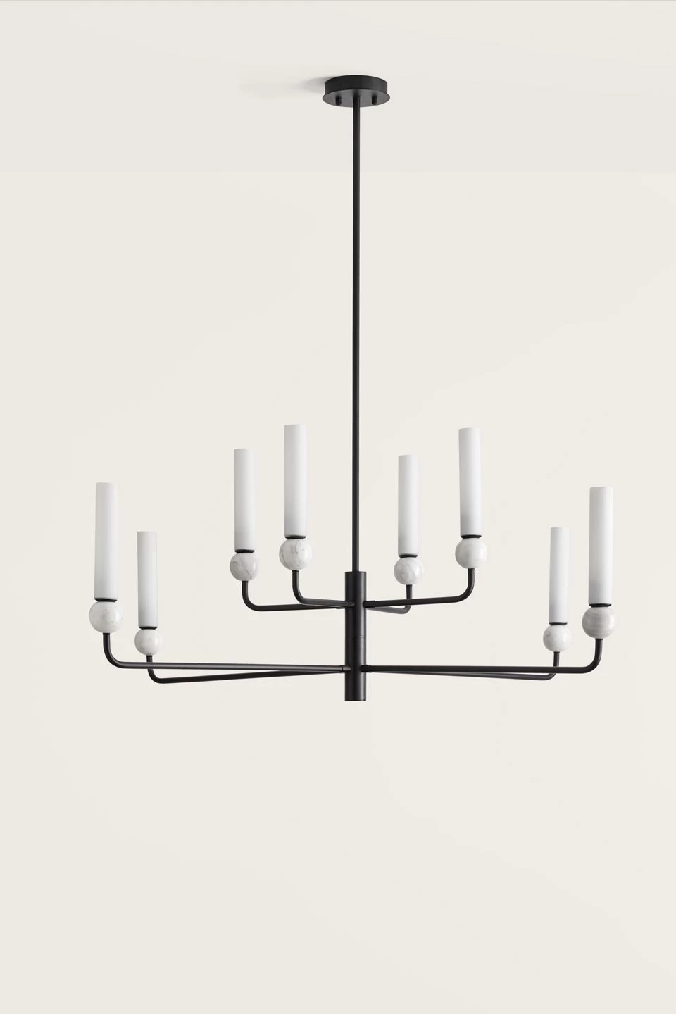 Superbe lustre Delie 8 lumières au design de chandelier contemporain, avec sa structure en acier noir mat, ses 8 diffuseurs en verre soufflé opale ou encore ses petites boules de marbre dont l’éclairage est assuré par ampoules LED incluses. Le lustre se compose de 8 bras sur 2 étages sur un cylindre central en acier noir. Chacun des bras est équipé d’un diffuseur cylindrique en verre opale blanc et d’une sphère de marbre blanc. Le lustre est doté d’un support de plafond rond en acier noir. La maison espagnole Aromas, fondée à Valence dans les années 1980, produit d’élégants et intemporels luminaires dans un style contemporain affirmé, tout en travaillant à partir de matériaux et techniques traditionnels, tel le marbre, la céramique ou le bois.