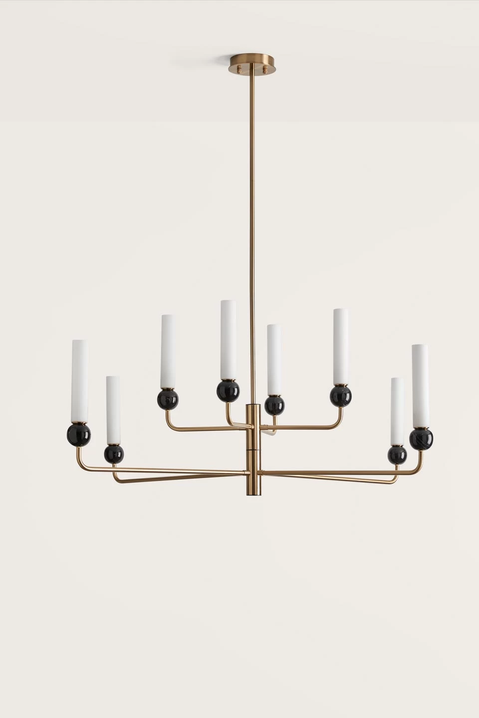 Superbe lustre Delie 8 lumières au design de chandelier contemporain, avec sa structure en acier or vieilli, ses 8 diffuseurs en verre soufflé opale blanc ou encore ses petites boules de marbre dont l’éclairage est assuré par ampoules LED incluses. Le lustre se compose de 8 bras sur 2 étages, fixés en étoiles sur un cylindre central en acier doré. Chacun des bras est équipé d’un diffuseur cylindrique en verre opale et d’une sphère de marbre noir. Le lustre est doté d’un support de plafond rond en acier doré et d’une tige de suspension coordonnée. La maison espagnole Aromas, fondée à Valence dans les années 1980, produit d’élégants et intemporels luminaires dans un style contemporain affirmé, tout en travaillant à partir de matériaux et techniques traditionnels, tel le marbre, la céramique ou le bois.