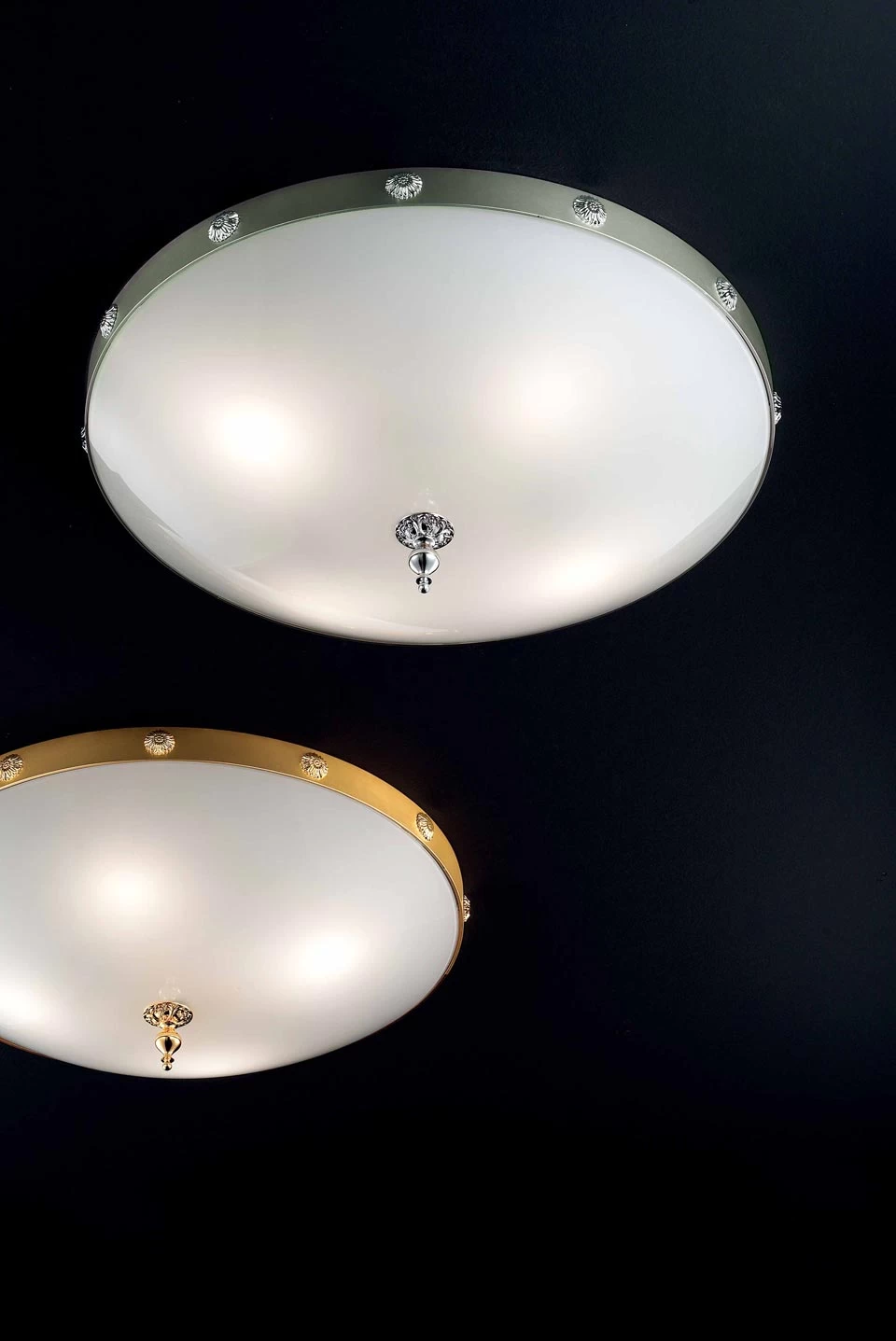 Beau plafonnier finition chrome de la collection classique Elegantia, qui porte son nom à merveille, le modèle est doté d’un cadre rond de métal chromé parsemé à intervalle régulier de moulures florales, ainsi que d’un dôme de verre blanc qui permet la diffusion d’une lumière vive et homogène. Le dôme est agrémenté d’une graine de métal argenté qui vient ajouter une touche chic au modèle. La maison italienne Masiero réalise un parfait mariage entre l’esthétique vénitienne classique et la créativité permise par les innovations technologiques, pour une collection élégante et pléthorique.