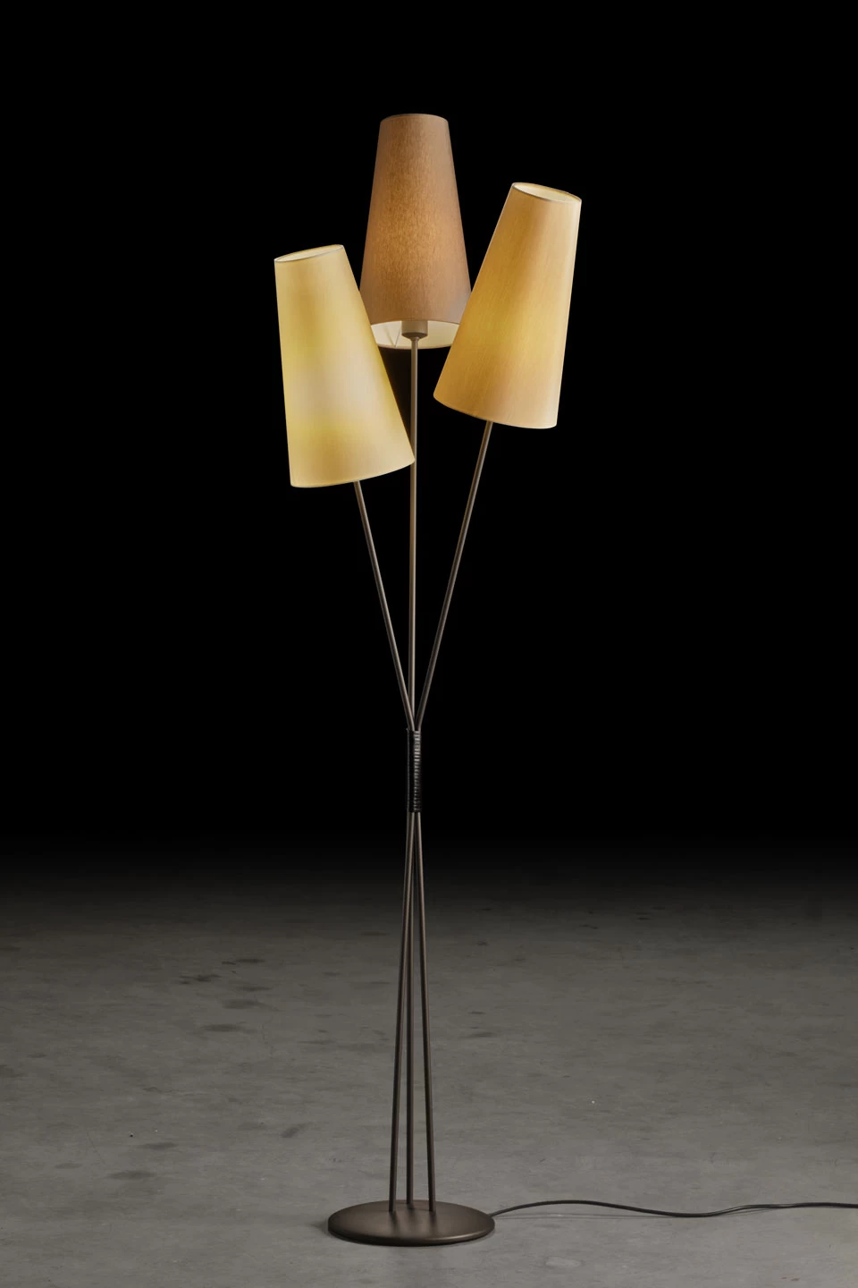 Fifties est trois lampadaires en un qui détourne une esthétique années 50, ici le modèle avec abat-jours en chintz champagne, sable et taupe, avec armature en métal fumé mat. Le modèle est composé d’un socle rond surmonté de trois pieds métalliques, attachés ensemble à mi-hauteur, et de trois abat-jours long coniques en chintz chacun d’une couleur différente (champagne, sable, taupe). Un interrupteur situé sur chaque douille offre la possibilité d’allumer et éteindre chacune des lumières indépendamment. Fondée en 1964 et marquée par son dévouement à la qualité, la maison familiale Holtkotter est une des dernières entreprises allemandes à encore manufacturer ses luminaires de A à Z, du métal brut au produit fini, avec une recherche permanente d’intégration des innovations technologiques sans jamais renoncer à la qualité de ses luminaires.