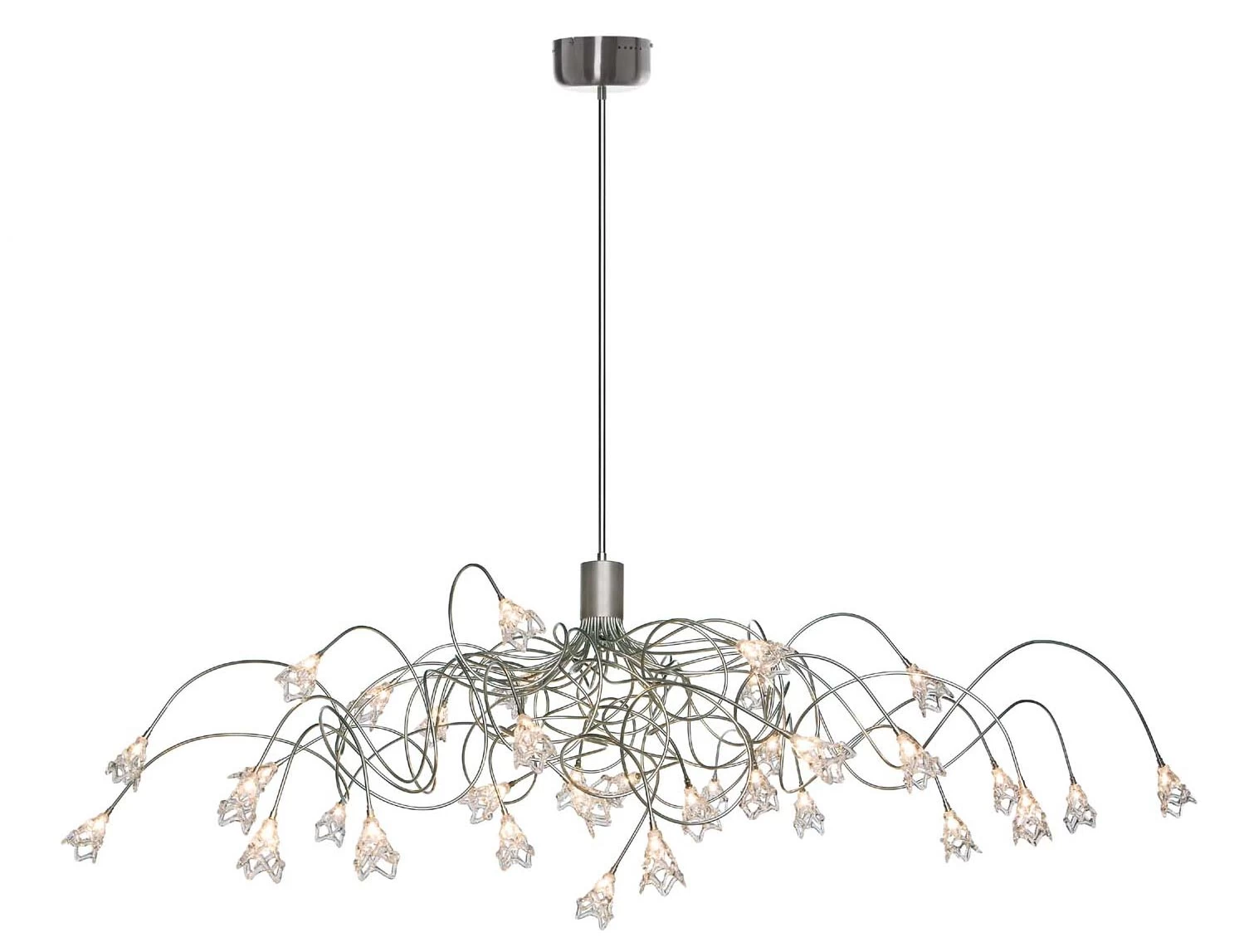 Encore un spectaculaire lustre, le lustre Ovale 35 lumières Flag d’Harco Loor qui fait partie de la gamme Flag en fil d’acier de 6mm, entièrement faite à la main, avec des fleurs de verre, clipsées sur le fil, hébergeant de petites ampoules G4. Les fils d’acier peuvent se tordre et se positionner individuellement. Ce lustre est bien évidemment une source de lumière, un luminaire, mais éteint il est également magnifique et peut être réellement considéré comme une sculpture. La gamme Flag comprend un lustre rond et un lustre ovale. Voir également la gamme Jewel Diamond. Chaque pièce est faite à la main, et signée individuellement de son designer Harco Loor. .
