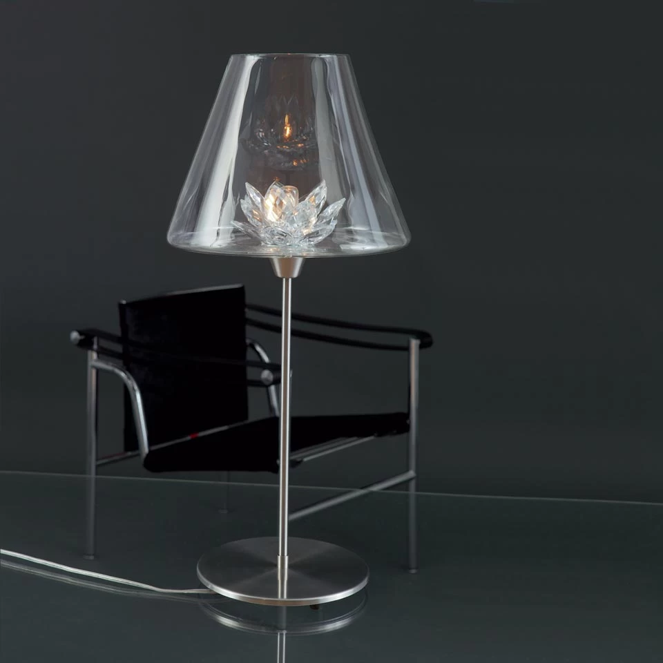 Une jolie lampe de table, le grand modèle 68cm de la collection Flower qui marie une touche classique à un design contemporain. La lampe est composée d’un socle et pied droit simple en inox, coiffé d’un abat-jour conique réalisée en verre transparent, qui abrite une délicate fleur en verre transparent minutieusement ciselée, dont le cœur est l’ampoule. Les pétales créent un prisme lumineux qui fait varier la lumière. Chaque modèle est fabriqué à la main au sein des ateliers Harco Loor et signé par le designer.