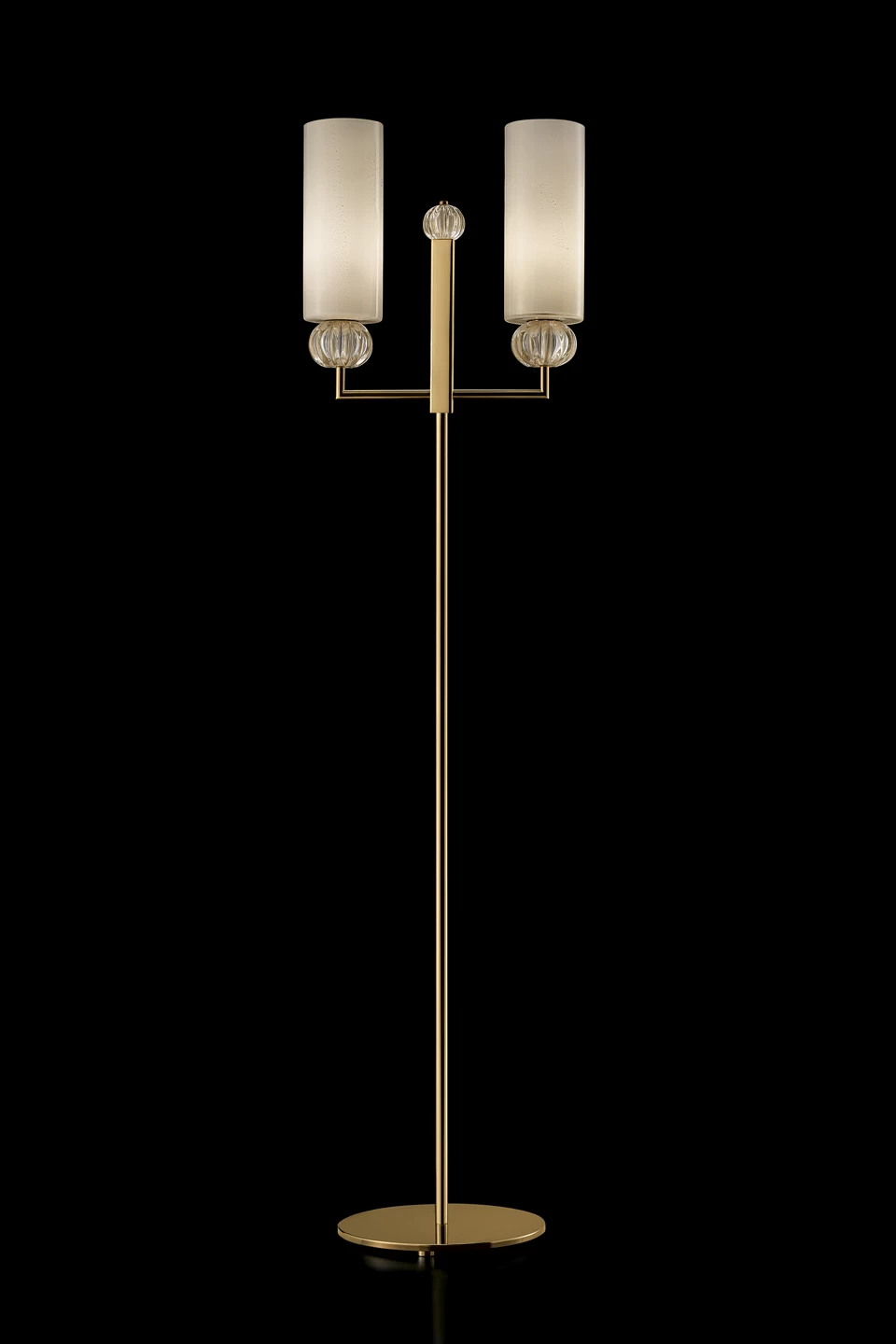 Superbe lampadaire Gallia, au design classique et élégant alliant métal or poli, diffuseurs en opale beige et décors en cristal de Murano incrustés de paillettes d’or. Le lampadaire est équipé d’un socle rond et pied droit en métal finition dorée polie, doté de deux bras en angle droit de part et d’autre du pied de sorte à former une espèce de trident anguleux, surmontés chacun d’un diffuseur cylindrique droit en cristal opale beige. C’est la fusion des verreries familiales Barovier et Toso, dont les noms sont historiquement liés au travail et au commerce du verre de Murano depuis le 14ème siècle, qui donne naissance à la maison qui porte leur nom, et est synonyme de la meilleure des qualités de travail du verre de Murano.