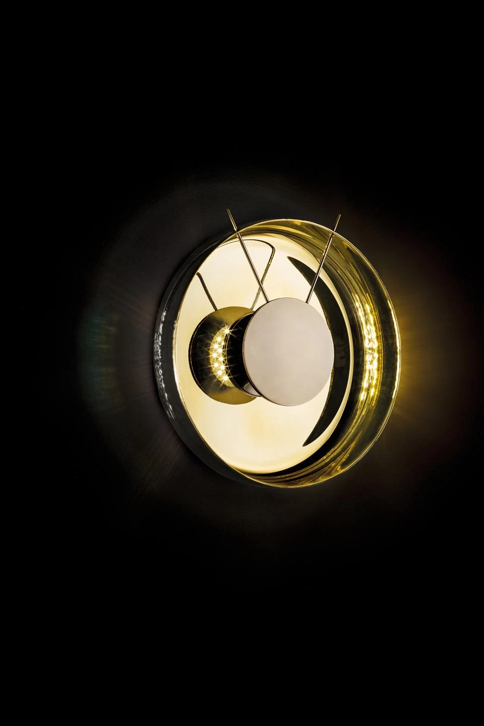 Gong a une allure tout à fait contemporain, avec son éclairage LED puissant au centre d’un disque de verre à la double finition métallisée dorée à l’intérieur et couleur titane à l’extérieur et le détail des deux antennes qui viennent casser la géométrie du modèle. La finition métallisée du verre crée un effet de miroir et joue avec l’éclairage LED, placé au centre, caché sous une platine en métal doré. La maison Italamp propose une diversité de collections qui mettent (littéralement !) en lumière et développent le riche héritage artisanal italien en matière de luminaire, avec la recherche de matériaux nobles et le mariage du classique et du contemporain en d’uniques designs.