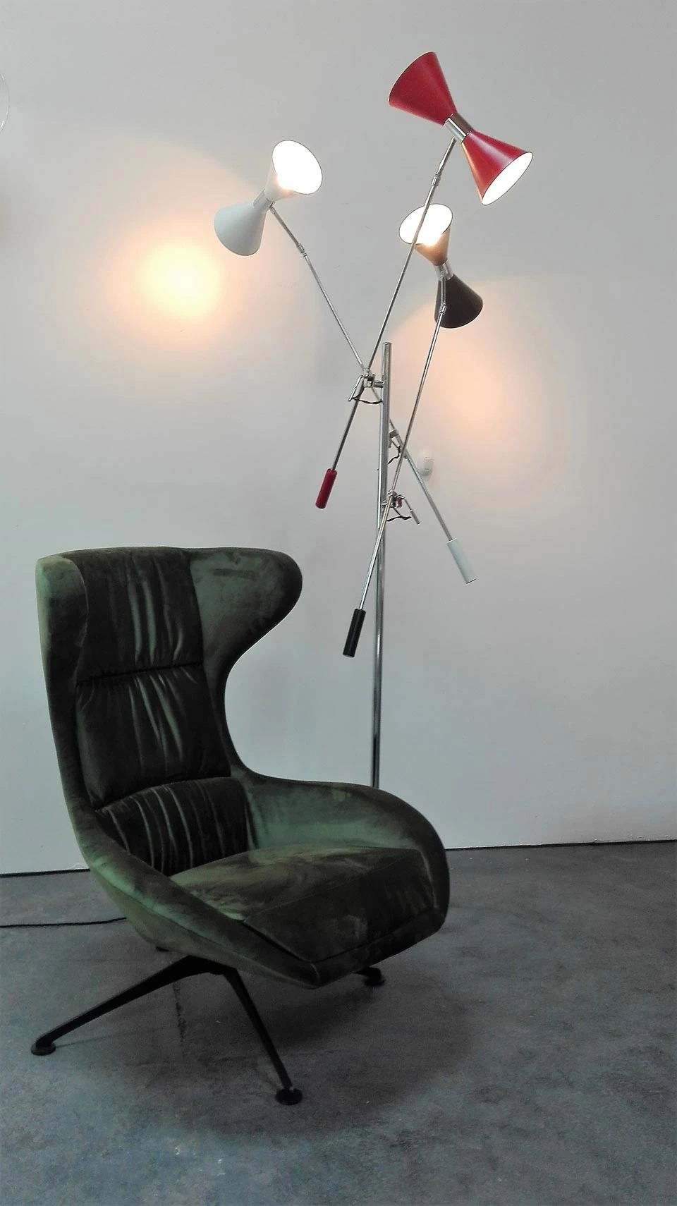 Sur cette page un lampadaire rétro à entièrement en laiton chromée et abat-jour laqué, constituée d’un pied sur lequel sont fixés trois bras articulés qui tiennent les trois abat-jours. Ceux-ci sont en forme de double cône, en aluminium laqué cernés d’une bague chromée. Chacun d’eux est d’une couleur différente, rouge, blanc et noir. La lumière est diffusée par les deux côtés des réflecteurs puisque chacun d’eux accueille une ampoule, ainsi qu’à travers les petits trous perforés sur la circonférence des cônes. C’est un modèle résolument rétro, inspiré des années 50’s.