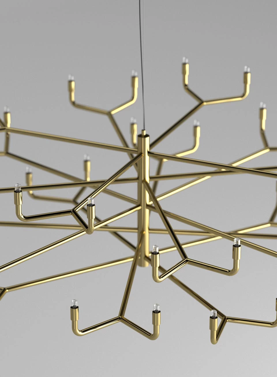 Grand Siècle or 24 carat 40 lumières est un lustre qui utilise les codes classiques du chandelier. C’est une lustre délicat au style contemporain affirmé entièrement réalisée en métal, il est constituée d’une multitude de bras horizontaux en fourche qui forment comme un branchage. Ils sont fixés à différentes hauteurs d’un tube central vertical. Les 40 petites ampoules sont simplement enchâssées au bout des bras. Le métal est travaillé avec une superbe finition or 24 carat. Le discret cône de plafond cylindrique est en métal assorti. La maison belge Axis71 en activité depuis les années 1970 propose une collection contemporaine éclectique tournée vers le métal. Une version en 24 lumières est disponible dans les options de commande au bas de cette page. Il peut également être réalisé en finition laqué blanc, laqué noir, bronze, chrome noir ou or mat, nous consulter pour ces options.