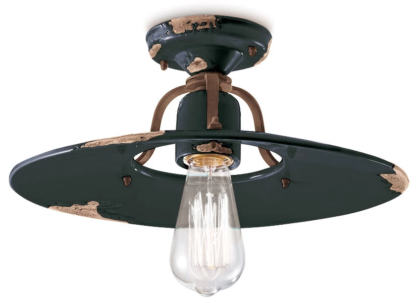 Superbe grand plafonnier de style campagne, qui s’inscrit dans l’esprit de la collection Country, avec son abat-jour et son socle en céramique noire écaillée selon un procédé artisanal, sa pièce de métal rouillé qui équilibre l’objet, et son ampoule apparente. L’ampoule est visible et nous vous conseillons l’usage d’une ampoule décorative dite de navigation référence 11020153 avec ce luminaire. Cette collection de la maison Ferroluce est le fruit du mariage d’une céramique de grande qualité, travaillée dans un style vintage, un métal rouillé, avec une esthétique et des formes industrielles et contemporaines. Ce plafonnier peut être commandé dans les 7 coloris visibles sur le nuancier dans la seconde image sur cette page et en 2 tailles dans les options de commande au bas de cette page. Par défaut, le produit est en noir, autres couleurs à préciser dans les instructions spéciales du bordereau de commande. La collection Country comprend également une suspension à contrepoids blanche visible sous la référence 18070232 et en turquoise sous la référence 18070233.