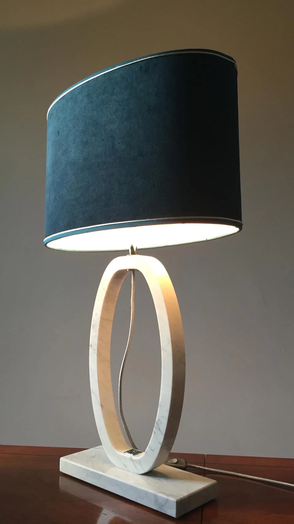 Un recherche d’originalité dans la sobriété cette lampe de table en marbre de Carrare blanc de la collection Déco. Elle est munie d’un large abat-jour de forme ovale en velours de coton bleu joliment bordé d’un galon argenté, et à l’intérieur blanc. Son pied forme un ovale linéaire et creux et repose sur un socle rectangulaire, l’ensemble étant en marbre. Son câble d’alimentation, recouvert de coton argenté et placé au centre de la forme vide, se pose en élément de décor. Cette collection est entièrement réalisée à la main par des artisans expérimentés dans les ateliers Matlight à Milan en Italie et de nombreuses personnalisations sont possibles, nous consulter.