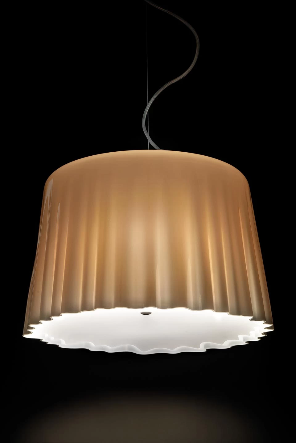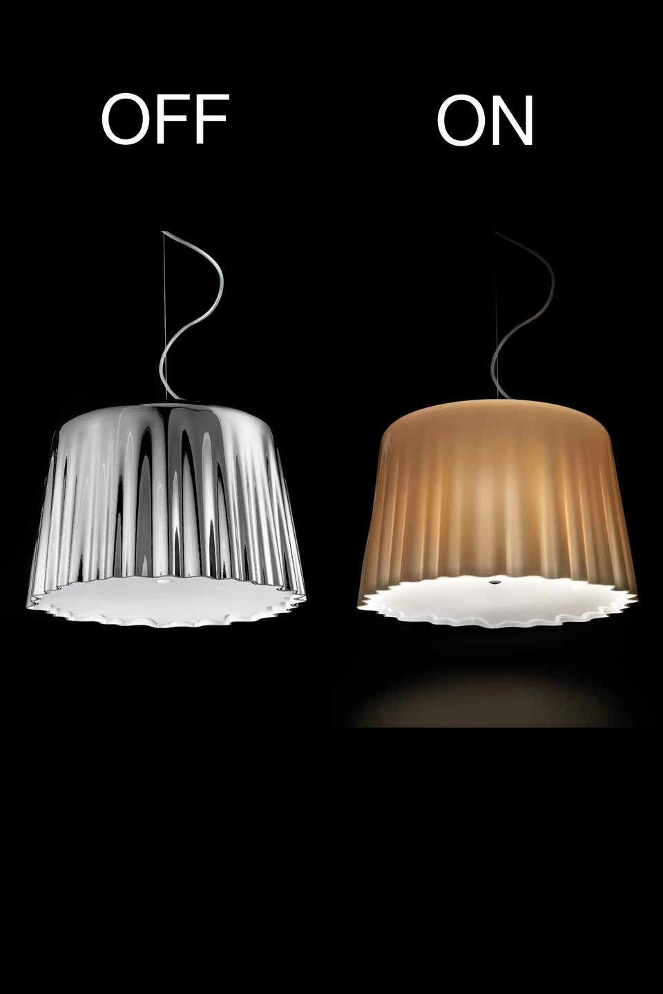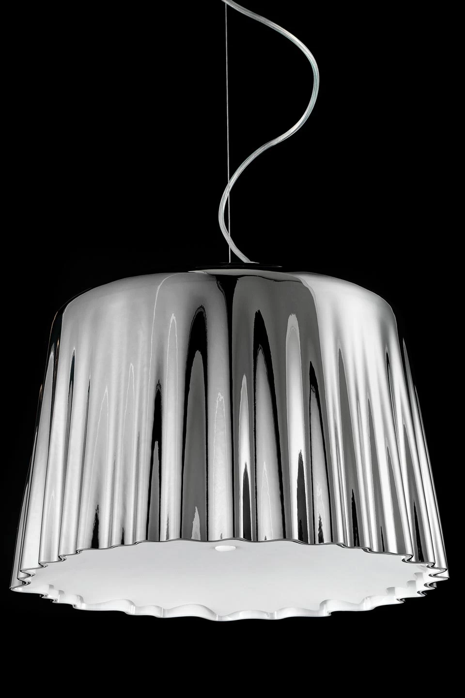 Cette grande suspension en verre de Murano métallisé et ambre à double aspect appartient à la collection Cloth de Vistosi. Eteinte, cette suspension apparaît métallisée . Allumée, elle devient ambre clair. L’effet est magique, cette suspension est tout à fait originale. La qualité de fabrication est exemplaire. Le verre est soufflé à la canne, et modelé à la main. Un diffuseur en verre dépoli incolore est placé en-dessous des trois ampoules. Excellente lumière, accentuée vers le bas, mais comprenant une composante d’éclairage d’ambiance aux tonalités chaudes et claires. Parmi les options de commande ci-dessous, on peut choisir la version double, pour laquelle chaque verrerie est suspendue à un câble métallique terminé par un piton. Le fil électrique s’enroule autour du câble, puis s’écarte du piton pour rejoindre un boîtier cylindrique discret, en portion de sphère de métal chromé. Ce modèle double est idéal pour l’éclairage d’une table rectangulaire ou d’un plan de travail. Cette suspension est réalisée par Vistosi, un des plus grands verriers italiens, établi à Murano, près de Venise. Voir aussi la suspension petit modèle, simple ou double, référence 13110151.