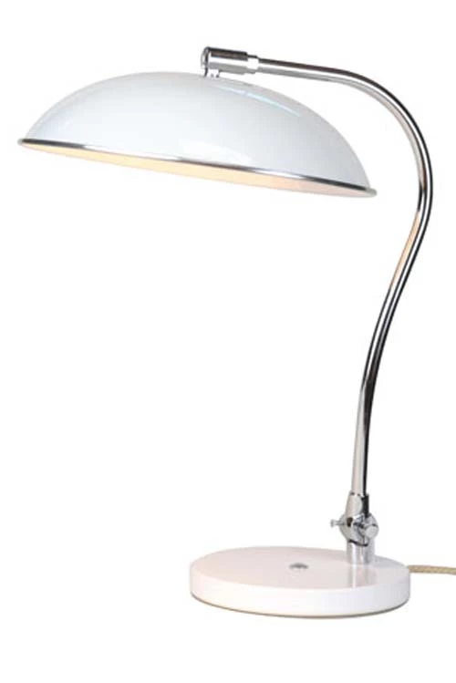 Hugo est un immense classique intemporel de la lampe de bureau. Cette lampe existe en crème, en blanc, en rouge, en noir et chromé. Son abat-jour est en métal laqué de couleur coordonnée au bas de la jambe ou tout chromé pour la version chromée. La tête-abat-jour est orientable ainsi que la jambe autour d’un axe à partir du socle. Le reste des parties métalliques est en métal chromé. Le fil électrique est recouvert de fil beige à l’ancienne.