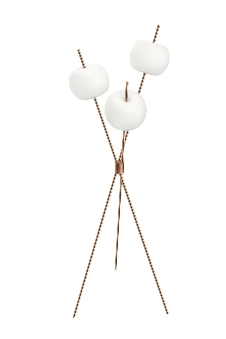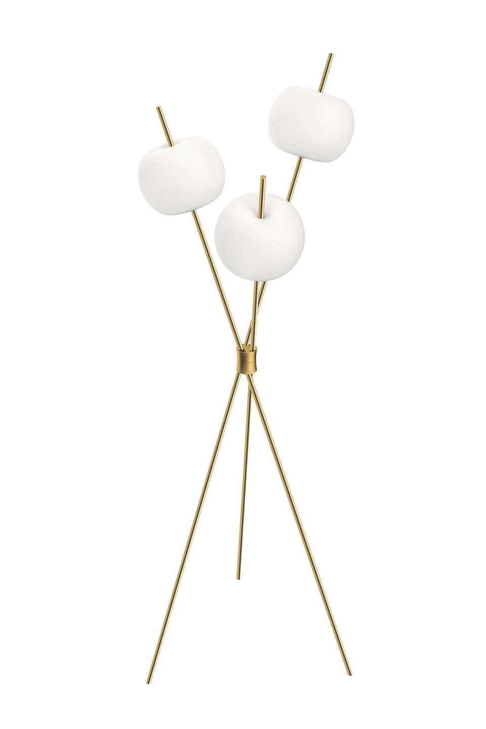 Imaginez un délicieux trio de Kushi, cette traditionnelle brochette japonaise qui donne son nom à la collection… voici sa matérialisation sous forme de lampadaire trois lumières de métal doré et boule de verre opale avec variateur de lumière inclus. Le modèle est composé de trois fines baguettes de métal verni finition laiton disposée comme l’armature en trépied d’un tipi, maintenu par une bague dorée. Sur chaque un diffuseur en boule de verre opale blanc soufflé double couche est comme enfilé, rappelant cette idée de brochette. Minimaliste et sophistiqué, le lampadaire est équipé d’un câble électrique noir ainsi que d’un variateur de lumière intégré, qui permet d’adapter la lumière chaleureuse et intense du luminaire. Le cosmopolitisme de la maison milanaise kdln, nouveau logo de l’ancienne Kundalini fondée en 1996, ne renie pas l’excellence du savoir-faire ancestral italien en matière de lumière, et c’est en entretenant créativité, fonctionnalité et précision que la maison s’impose comme un incontournable, avec ses collections éclectiques qui mêlent poésie, simplicité et caractère.