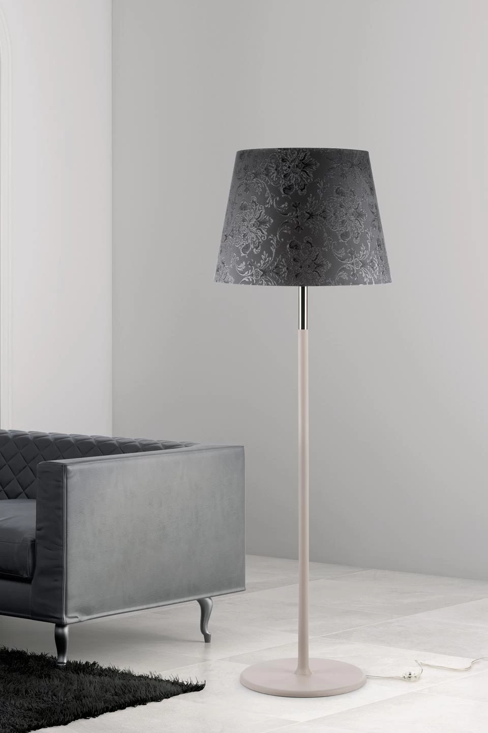 Superbe lampadaire de l’élégante gamme Arty Mate, qui marie un pied en bois laqué beige et le métal chromé à un superbe abat-jour conique large en tissu gris foncé, fermé d’un diffuseur blanc et décoré de motifs floraux classiques du plus bel effet. grâce à son large abat-jour, c’est un modèle qui aura sa place dans un grand séjour.