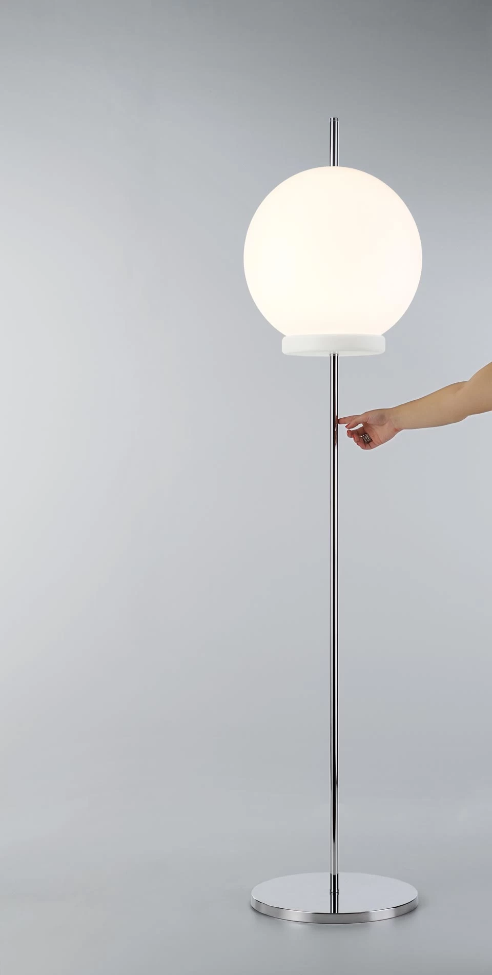 Superbe lampadaire Prick aux lignes minimalistes et design contemporain, avec son diffuseur en forme de boule en acrylique blanche, posée sur undisque de bois laqué blanc, et l’ensemble est perché sur une tige et un disque comme socle en métal chromé. L’ éclairage est assuré par un module LED logé dans le globe et le câble d’alimentation est transparent.