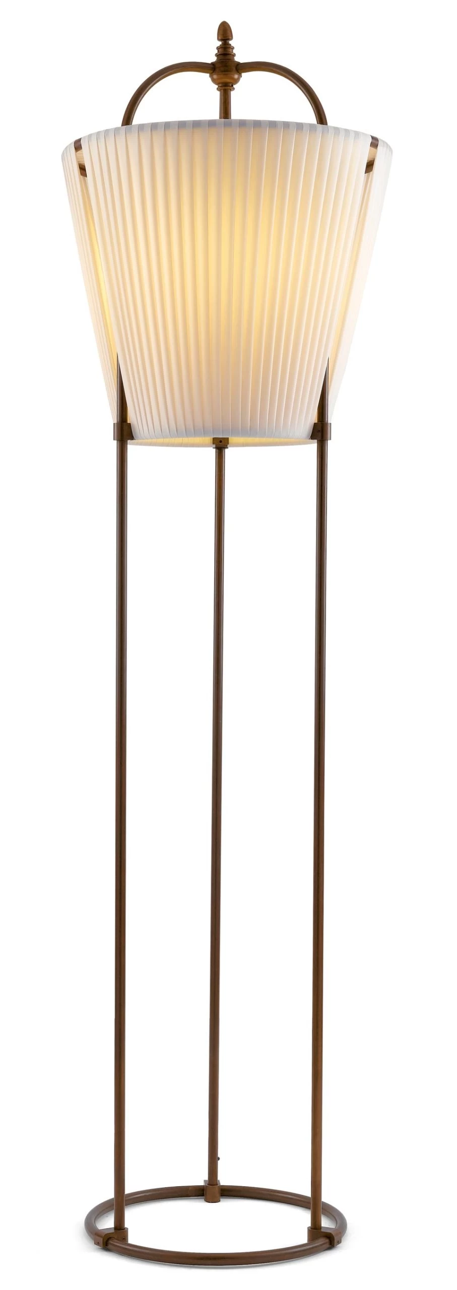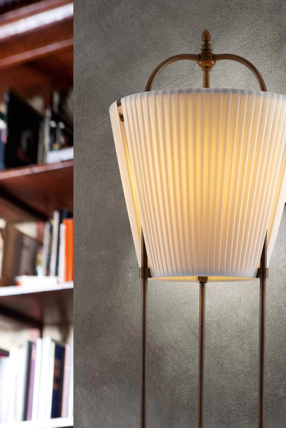 Avec un abat-jour en cône tronqué retourné vers le haut, ce lampadaire en soie beige produit une très belle lumière d’ambiance tamisée, et un éclairage indirect vers le plafond plus accentué. Avec un poids de 7kg seulement, ce lampadaire de grande taille reste léger et très facile à déplacer. Le socle est constitué d’un cercle de tubes de laiton patiné marron foncé. Trois montants verticaux recourbés à leur extrémité verticale se regroupent au sommet de ce lampadaire. Les rubans de soie sont tendus sur deux cercles horizontaux. L’éclairage est produit par une ampoule d’une puissance maximale de 120W, qu’on peut choisir halogène. Les parties métalliques sont réalisées en laiton, et reçoivent une très belle patine conférant un aspect vieilli très esthétique. La fabrication, traditionnelle, est menée dans les ateliers d’Aldo Bernardi, à Trévise en Italie. Dans cette série de luminaires recouverts de rubans de soie beige, on trouve 5 autres modèles de lampadaires (12120045, 12120048, 12120049, 12120050, 12120051), deux suspensions (visibles sous la référence 12120052) et une très belle applique référence 12120054.