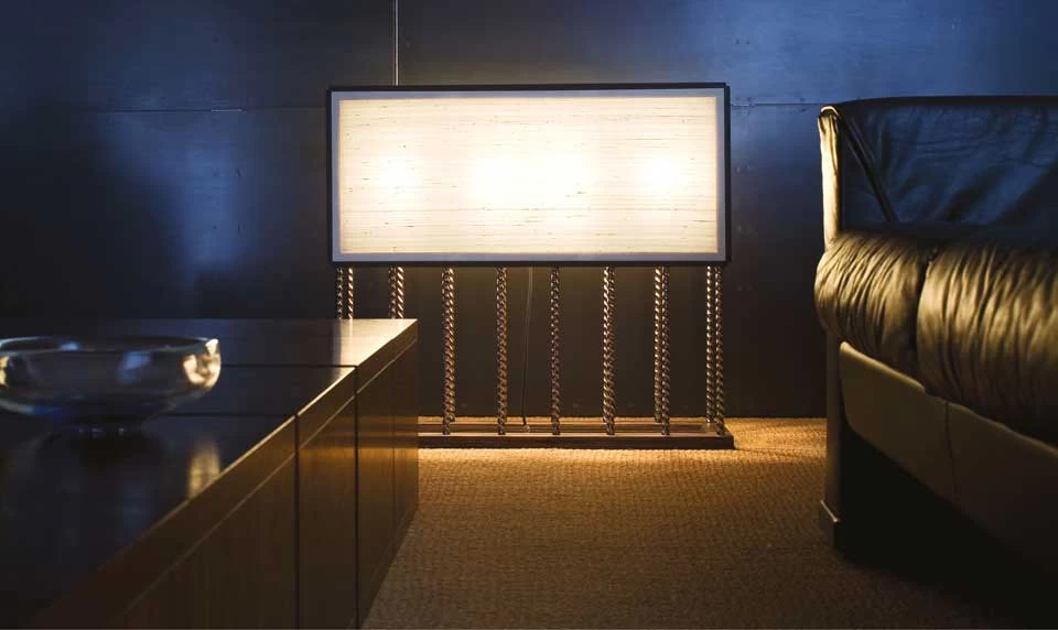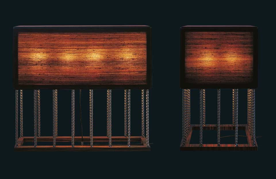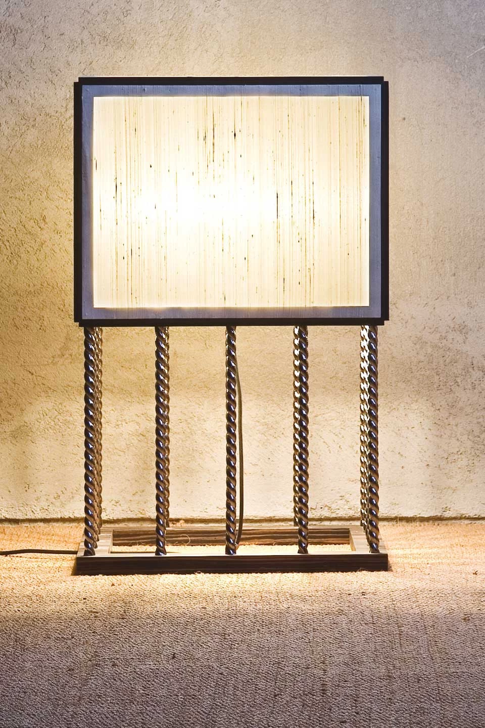 Ce splendide et tout à fait original lampadaire en cube est réalisé en bronze et en ébène de Macassar. Il est recouvert de soie indienne. Il s’appuie sur seize pieds torsadés en bronze, qui sont réunis à leur base par un montant horizontal carré réalisé en ébène de Macassar. Les pieds supportent un cube recouvert de soie. Deux tailles sont proposées sur cette page, à choisir ci-dessous: le modèle standard, de 45cm de coté et 75cm de hauteur, et la version large de 78cm de largeur et d’une épaisseur de 24cm seulement, idéale pour placer le long d’un mur. Sous la référence 13060139, on peut également découvrir la version grand modèle, de 113cm de hauteur. Pour chaque taille, on peut choisir un tissu ivoire ou marron foncé. Le tissu utilisé, tissé de façon artisanale, a une trame irrégulière et quelques peluches.
