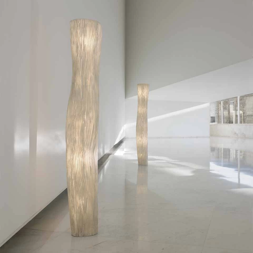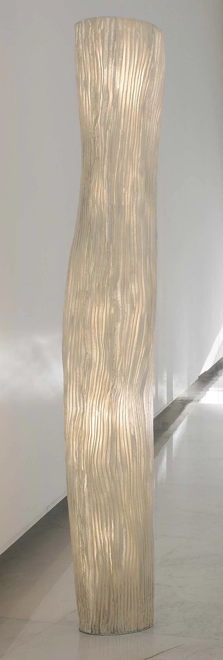 Ce lampadaire cylindre en tissu plissé peint en blanc de la collection Gea s’équipe de cinq ampoules à vis standard, que l’on peut choisir halogène, LED ou fluorescentes. Il produit ainsi une vive lumière, magnifiquement tamisée par le tissu peint dont il est fait. Ce tissu (formé d’un fin treillis métallique peint) constitue une des innovations marquantes de la très créative société Arturo Alvarez, et procure un charme distinctif incomparable. Pour changer les ampoules, rien de plus simple: le tissu est refermé par une fermeture éclair de très belle facture. Avec 180cm de hauteur, ce lampadaire ne mesure que 28cm de diamètre, et avec cette faible empreinte au sol trouve ainsi sa place facilement dans tous les intérieurs. Fabrication de haute qualité, dans les ateliers d’Arturo Alvarez en Espagne. Il existe une applique coordonnée, visible sous la référence 12110365.