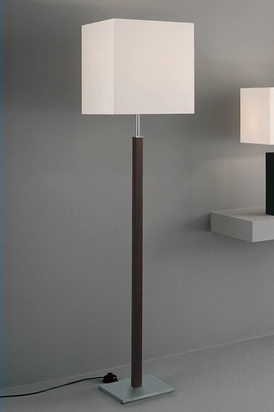 Ce lampadaire en noyer foncé et en métal chromé est décoré d’un abat-jour carré en chintz blanc. Le socle, également carré, est réalisé en métal nickelé mat. Le pied est fabriqué en noyer foncé. A son sommet, une tige en métal chromé porte l’abat-jour. Il existe une lampe de table coordonnée, disponible en deux tailles, visible sous la référence 12070012. La fabrication, d’une qualité tout à fait exemplaire, est effectuée dans les ateliers de Baulmann Leuchten en Allemagne.