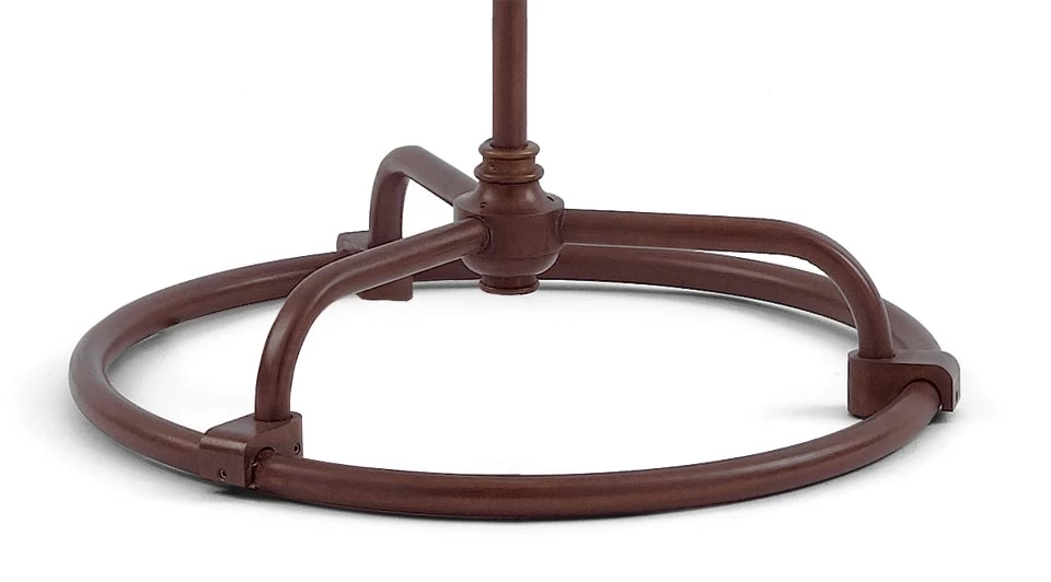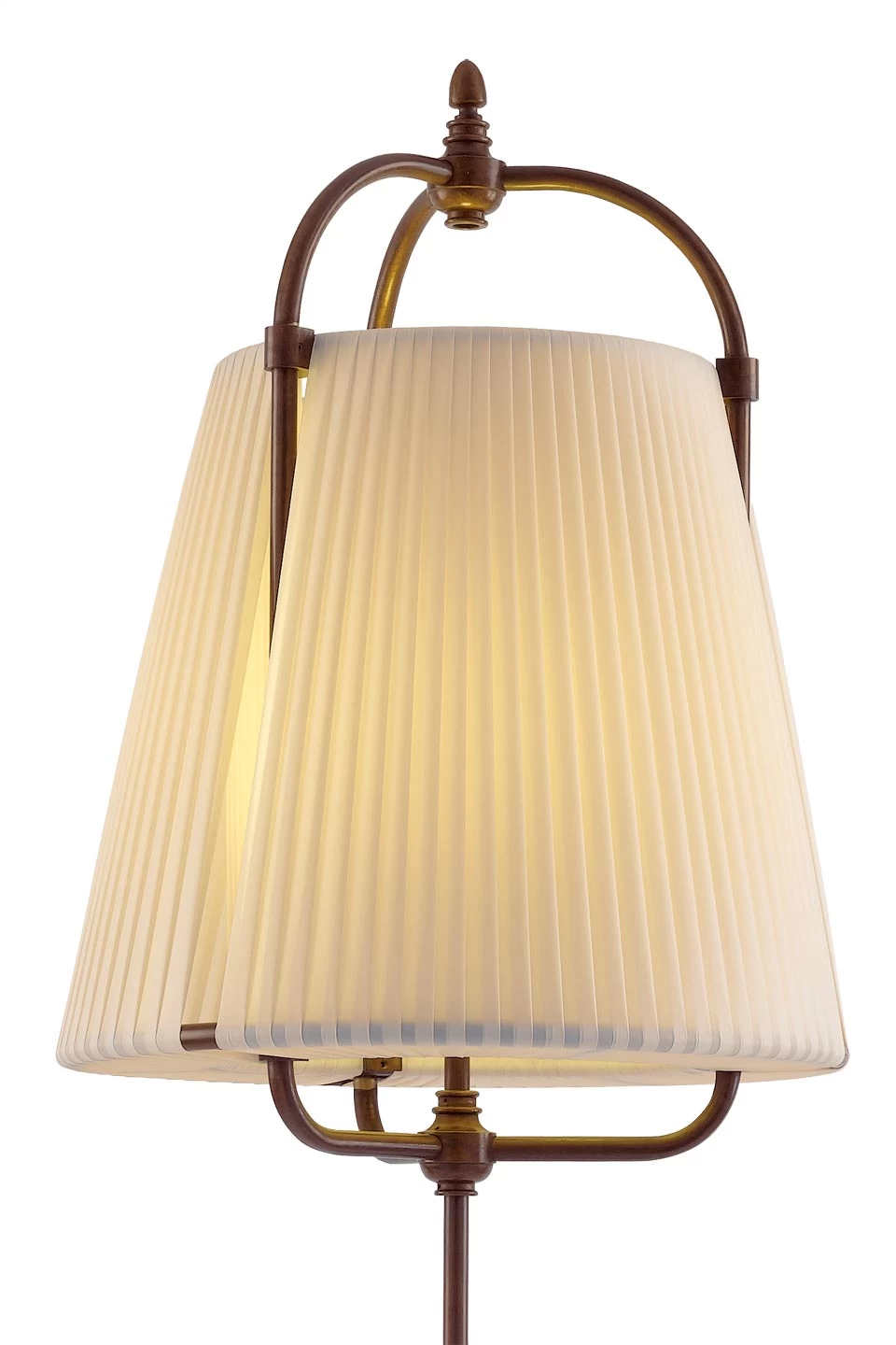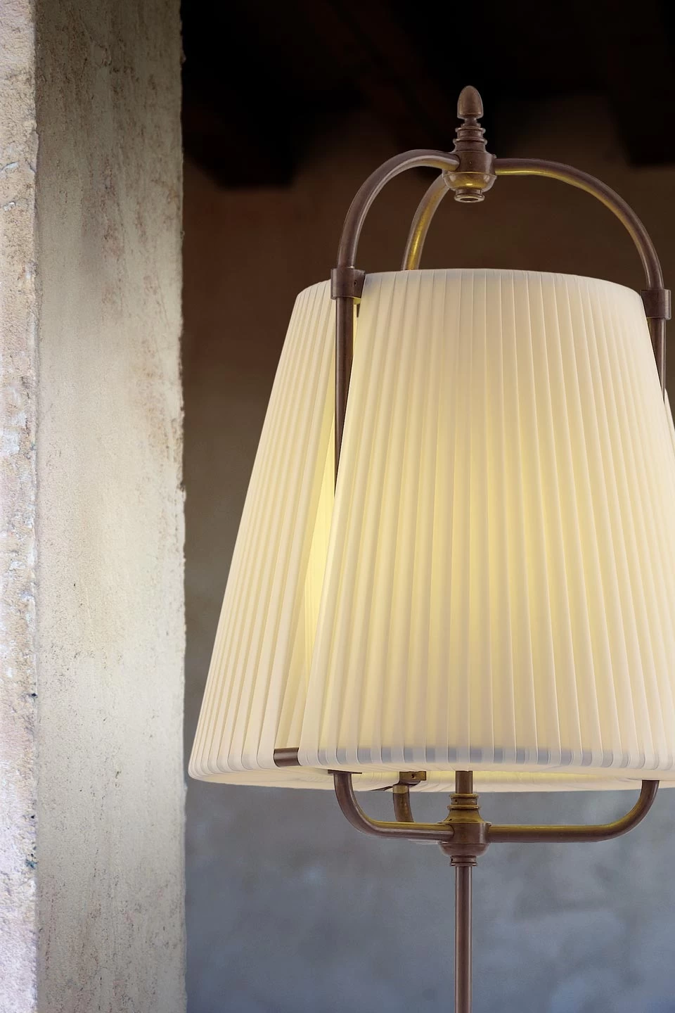 Cet étonnant lampadaire aux formes néanmoins classiques est tendu de soie beige en rubans. L’abat-jour est en forme de cône, les parties métalliques sont réalisées en laiton patiné foncé. Le socle rond confère une très bonne stabilité à ce grand lampadaire de 180cm de hauteur, qui ne pèse que 7.8kg. Le pied est constitué d’un seul tube vertical, fin et discret. A son sommet, trois tubes recourbés portent l’abat-jour et le système d’éclairage. Ce lampadaire est très apprécié dans des environnements raffinés. L’éclairage est homogène, clair mais jamais éblouissant. La fabrication, traditionnelle, est d’une qualité exceptionnelle, elle est assurée dans les ateliers d’Aldo Bernardi à Trévise, en Italie.