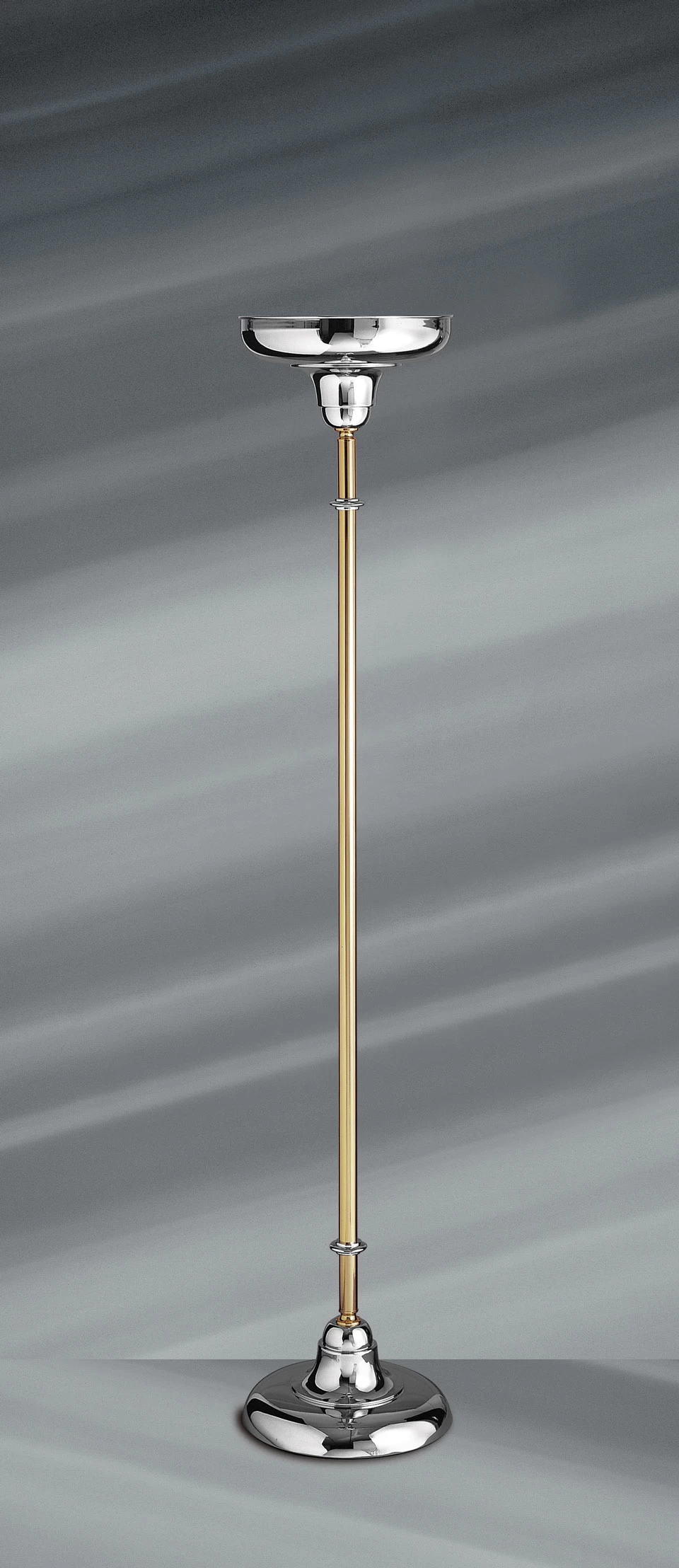 Tout de chrome et d’or, ce lampadaire au parfait style Art Déco est doté d’un socle rond en cloche de métal chromé avec cet effet miroir si particulier qui donne le ton de l’époque, surmonté d’un pied droit en laiton doré, et équipé d’un abat-jour en cloche inversée chromée qui créé un effet de parfaite symétrie avec le socle, rappelant l’inspiration géométrique et architecturale antique de l’esthétique Art Déco. Une lampe de table assortie est visible sous la référence 22050090.