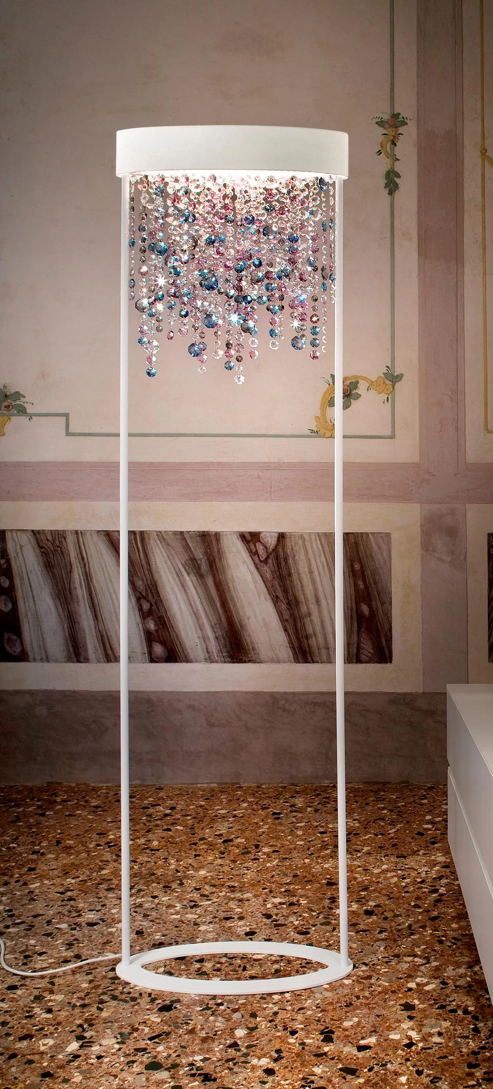 Un travail original et réussi pour ce lampadaire Ola en métal verni blanc mat et pampilles en verre italien multicolore aux tons froids. Les rangées de breloques sont fixées à l’armature sous l’abat-jour de forme elliptique et sont joliment suspendues entre les deux pieds rond posés sur un socle, en forme d’anneau elliptique également, et reflétant une très jolie lumière. Ce lampadaire s’intégrera facilement dans différentes pièces de votre intérieur, en apportant une touche d’éclat et un bel éclairage. Dessiné par Fly Design Studio, ce luminaire est fabriqué avec des matériaux de haute qualité dans les ateliers Masiero en Italie. Une lampe de table assortie est proposée sous la référence 16020251.