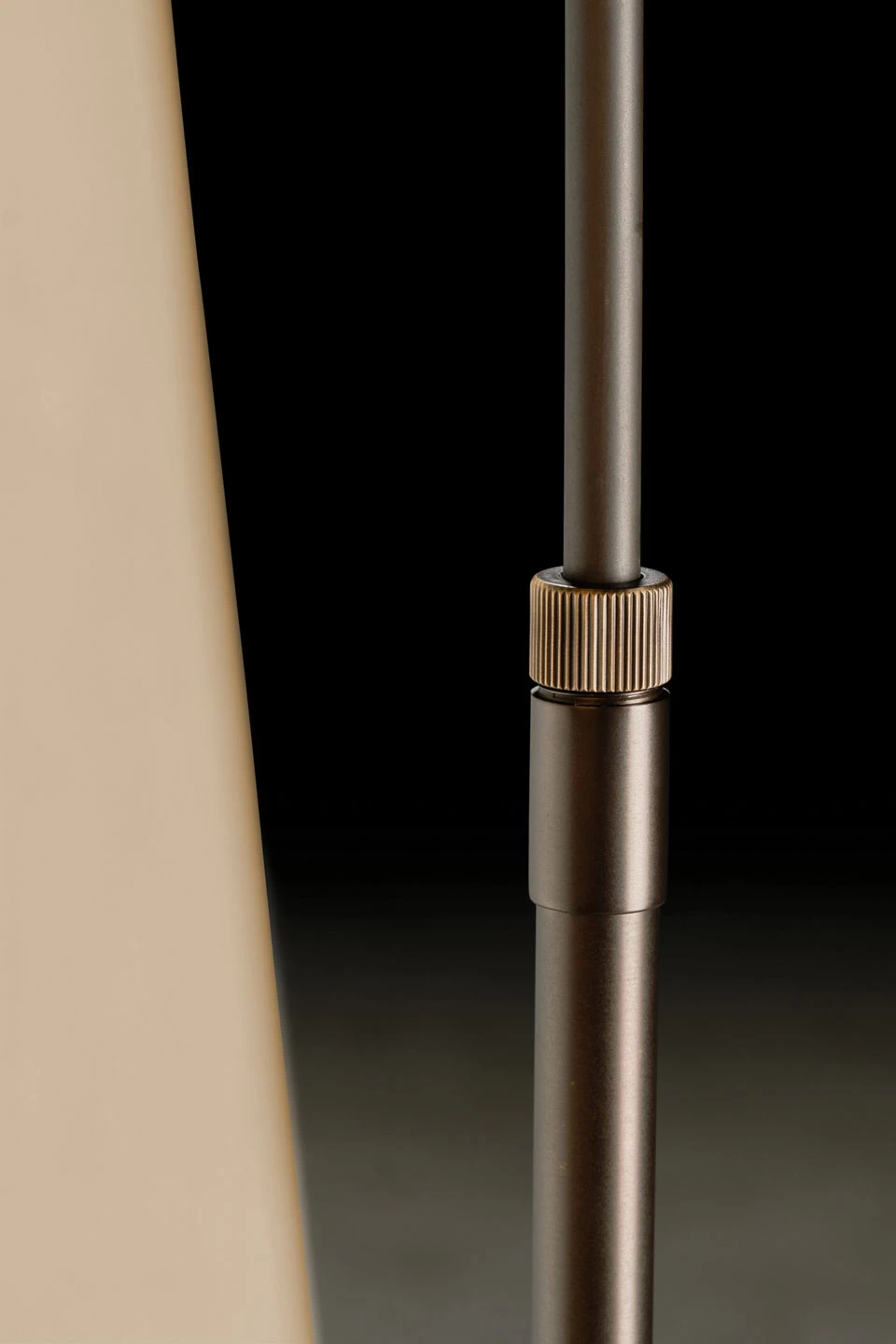 Un profil élancé et fin avec armature métallique finition fumé mat, un abat-jour en chintz aux belles proportions, c’est le lampadaire-liseuse classique LampBoy. Le modèle est doté d’un petit socle en disque de métal surmonté d’un pied en deux parties, l’une droite et l’autre une tige fine en col de cygne réglable en hauteur, le tout en métal finition fumé mat qui lui donne une patine particulière, et coiffé d’un abat-jour de 26cm de diamètre légèrement conique en chintz couleur sable. Le modèle, idéal éclairage de salon, diffuse une lumière chaleureuse et homogène. En activité depuis plus de 35 ans et une des rares entreprises allemande restante à manufacturer ses luminaires du métal brut au produit fini, la maison familiale Holtkotter livre années après années des collections au design raffiné et aux finitions ciselées.
