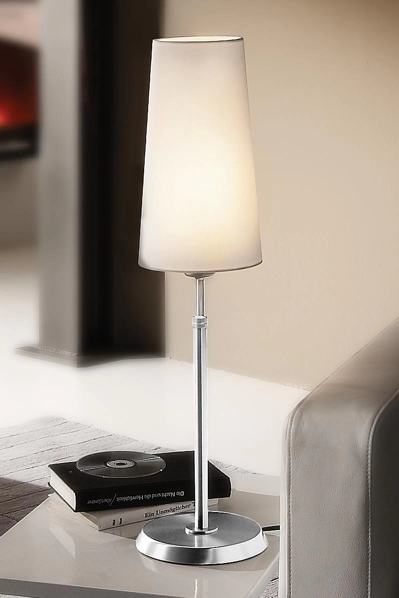 Cette originale lampe est simplement constituée d’un abat-jour en chintz de coton blanc légèrement conique placé à l’extrémité d’un pied en métal nickelé mat réglable en hauteur. Le socle, lesté, apporte une excellente stabilité à ce luminaire. Il prend la forme d’une section de cylindre, dont les bords sont légèrement évasés, rehaussé à la base du pied par un fin disque de la même matière. La lumière produite par une ampoule halogène de 75W est filtrée avec élégance par l’abat-jour réalisé en chintz de coton blanc. Il existe un lampadaire coordonné visible sous la référence 12050611. Ce luminaire est fabriqué en Allemagne, dans les ateliers de Holtkötter. La fabrication est d’une qualité exemplaire. Le fini des surfaces métalliques se situe au meilleur niveau des productions européennes. Par ses matières très neutres, cette lampe peut être installée dans tous les environnements décoratifs, en ville comme en bord de mer ou à la montagne. Avec un diamètre d’abat-jour d’une dizaine de centimètres, cette lampe n’encombre pas, ce qui lui permet d’être mise en place dans des situations où l’espace disponible est limité.