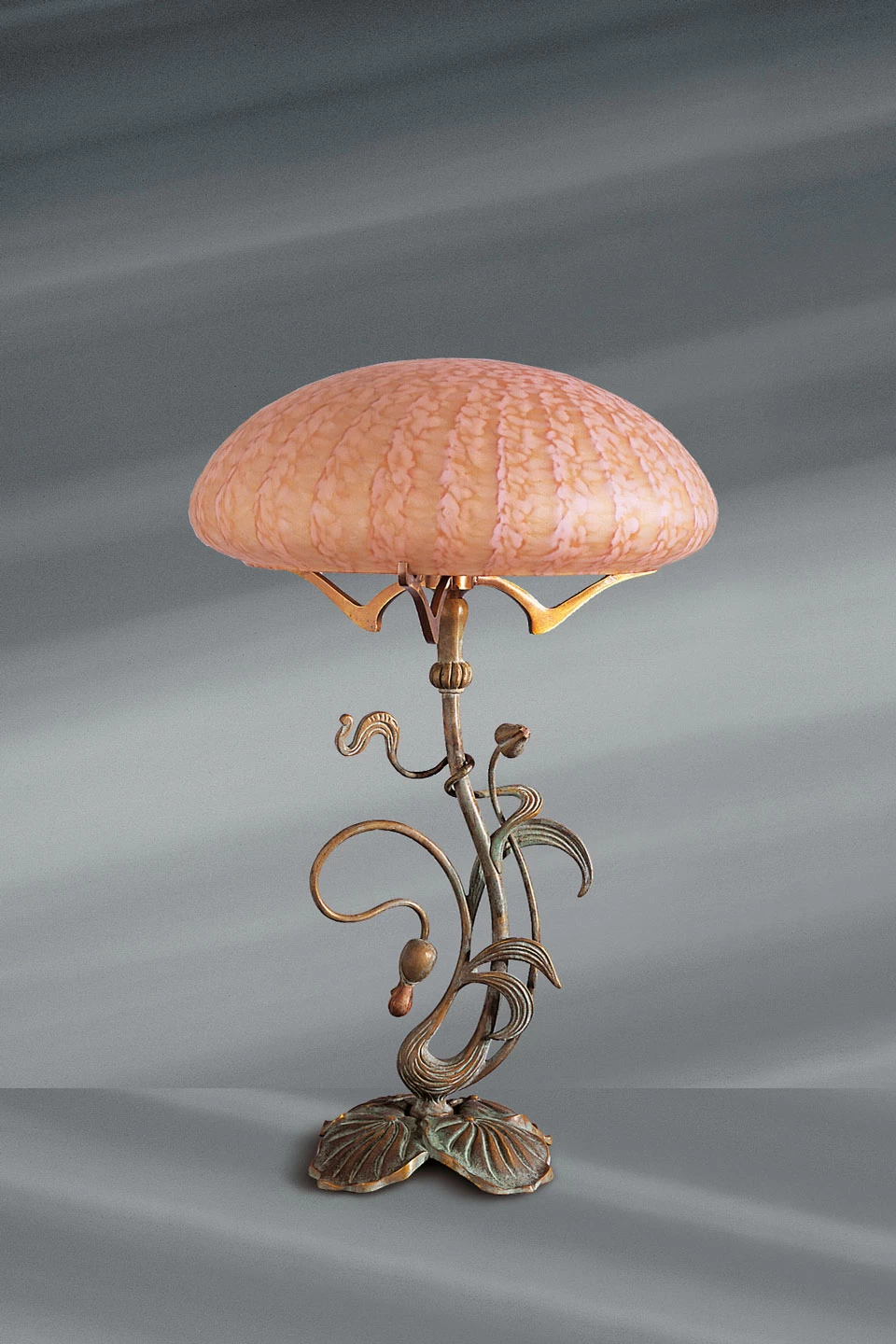 A mi-chemin entre une étrange plante exotique et une créature sous-marine évoquant une méduse, cette superbe lampe de table parfaitement Art Nouveau est réalisée en bronze et pâte de verre rosée. Le modèle se compose d’un socle moulé en bronze qui représente des feuilles de nénuphars, sur lequel se dresse le pied tout de volutes accentuant l’inspiration sous-marine et évoquant la sensation de lévitation que procure l’eau, et décoré de petites bourgeons fermés. Le pied est couronné d’un bel abat-jour à la forme arrondie de chapeau de champignon, en pâte de verre rose striée, et fixé par quatre bras discrets qui soutiennent l’abat-jour. Notez la finition vert-de-gris du bronze qui donne une patine authentique au modèle. La collection incarne parfaitement l’esthétique romantique à la végétation foisonnante du style Art Nouveau, que vous pouvez trouver par exemple sur certains portiques d’époque du métro parisien.