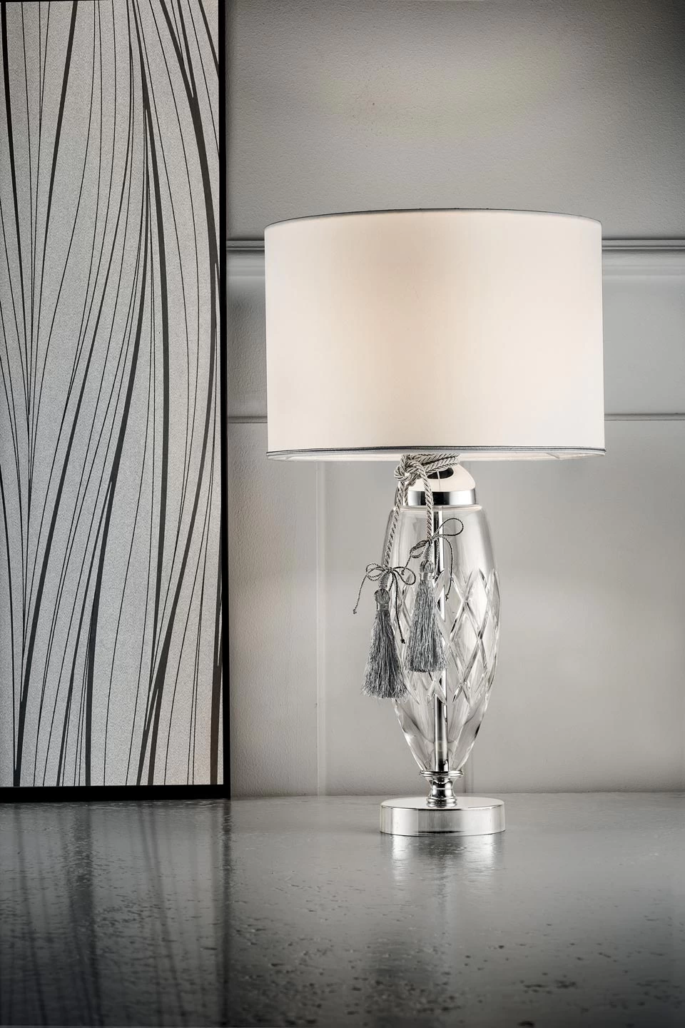 Belle lampe de table dans un style classique, constituée d’une pied de verre soufflé de Murano transparent autour d’une tige de métal chromé, sur un socle circulaire en métal chromé, et coiffée d’un large abat-jour cylindrique en satin blanc, bordé de fin liserés argentés. Le verre est gravés d’un motif géométrique simple fait de croisement de lignes, et la touche originale du modèle réside dans la cordelette à pompons argentés attachée autour du pied.