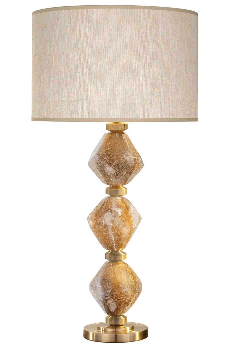 Design et minérale, cette lampe de table Argyle Diamond est un modèle contemporain fait d’un pied en trois blocs de verre sculptés de manière irrégulière, à la manière d’un quartz naturel. Les blocs entre eux sont fixés par de petites pièces cylindriques de laiton doré, et la base de la lampe est également faite d’un disque doré. Le pied est coiffé d’un bel abat-jour cylindrique en tissu beige. Chaque pièce de verre est sculptée à la main, ce qui fait de chaque lampe un modèle unique.