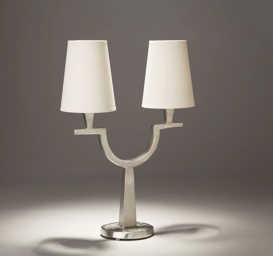 La lampe de table 2 lumières Perceval nickel satiné est entièrement réalisée en bronze massif. Les bras forment un demi-cercle terminé par deux parties horizontales sur lesquelles sont attachés les abat-jour coniques blancs. Sobre et élégante, cette lampe trouvera sa place dans un intérieur citadin. Equipée d’ampoules de 100W, elle fournit un éclairage puissant. Le bronzier Augustin Granet utilise des techniques de moulages issues de l’industrie qui apporte irrégularités et force à la matière. Ce savoir-faire associé à un design toujours élégant et à la noblesse du bronze nous offrent une collection de luminaires raffinés, destinés aux plus belles demeures. Par défaut, ce luminaire est livré avec l’abat-jour proposé sur cette image mais le tissu peut être choisi dans le nuancier visible en photo complémentaire sur cette page, choix à préciser dans les informations spéciales de votre formulaire de commande. La lampe Perceval est visible en finition dorée sous la référence 17090361 et en finition noir patiné sous la référence 17090360.