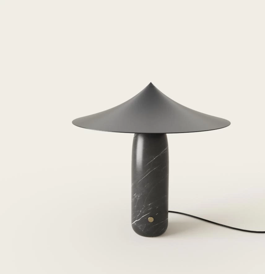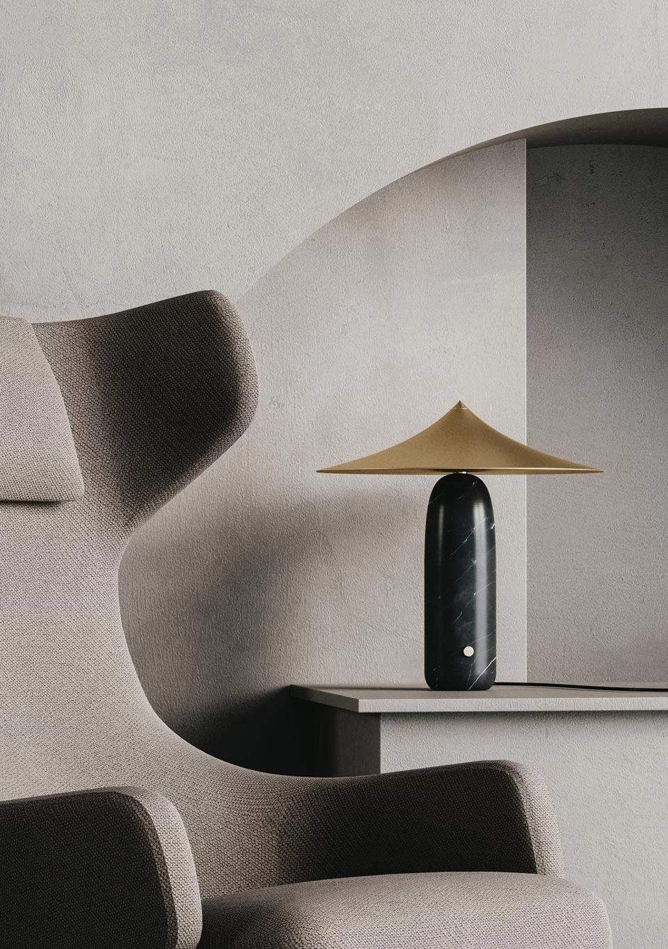 Le modèle est également disponible en version marbre noir/abat-jour doré dans les options de commande au bas de cette page, ainsi qu’en version marbre blanc/acier noir sous la référence 21110022.