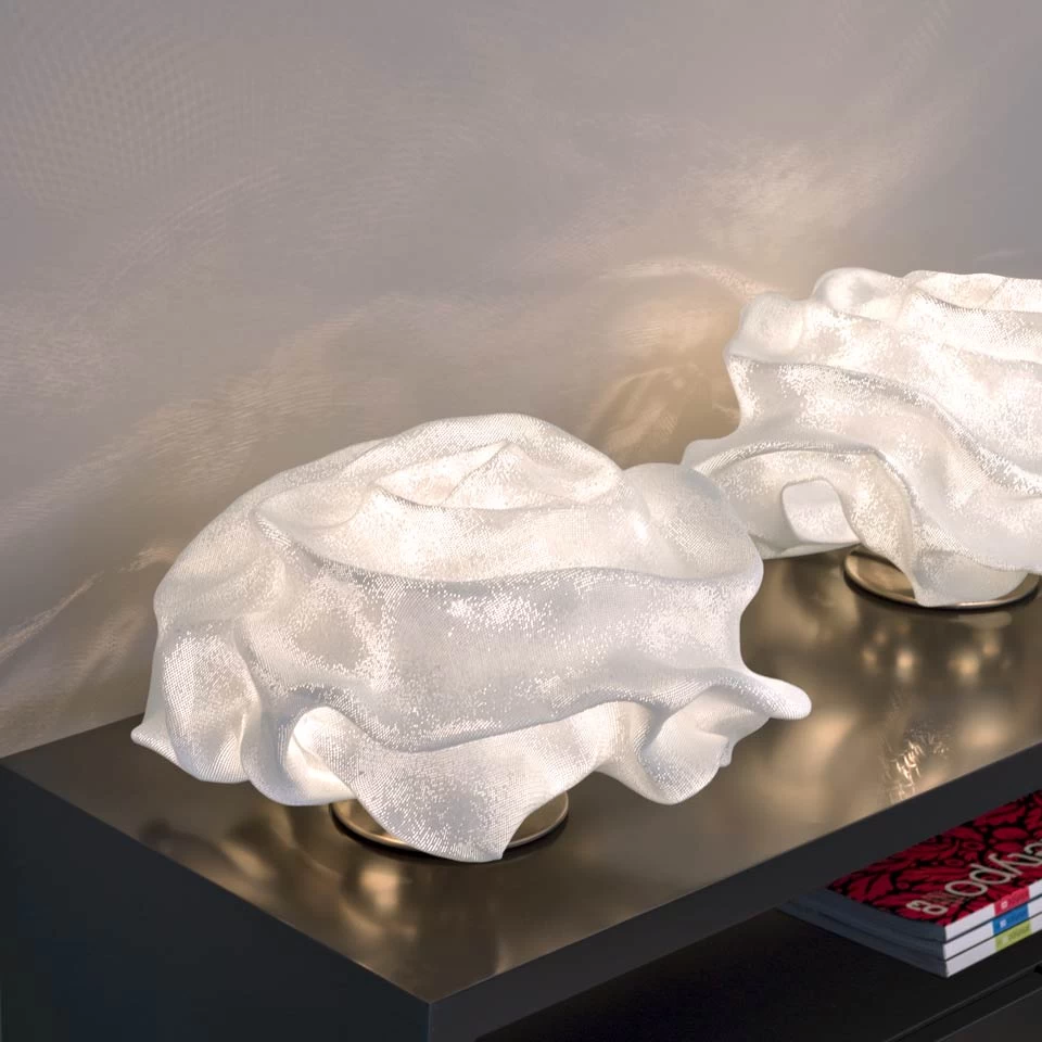 Lampe de tissu blanc en forme de fleur Nevo. Elle est formée d’un ensemble de tissus peints et formés pour représenter une fleur. Le tissu est formé d’un fin treillis métallique peint. Cet élément constitue le diffuseur de la lampe. Un pied en inox de forme ronde supporte l’ampoule et maintient l’ensemble. La lumière est produite par deux ampoules d’une puissance maximale de 60W, cette lampe fournit un très bel éclairage d’ambiance. La fabrication, d’une qualité exemplaire, est menée dans les ateliers d’Arturo Alvarez, en Espagne. On trouve dans cette collection Nevo une applique murale disponible en deux tailles (12110377), et une suspension disponible en trois tailles (12110376).