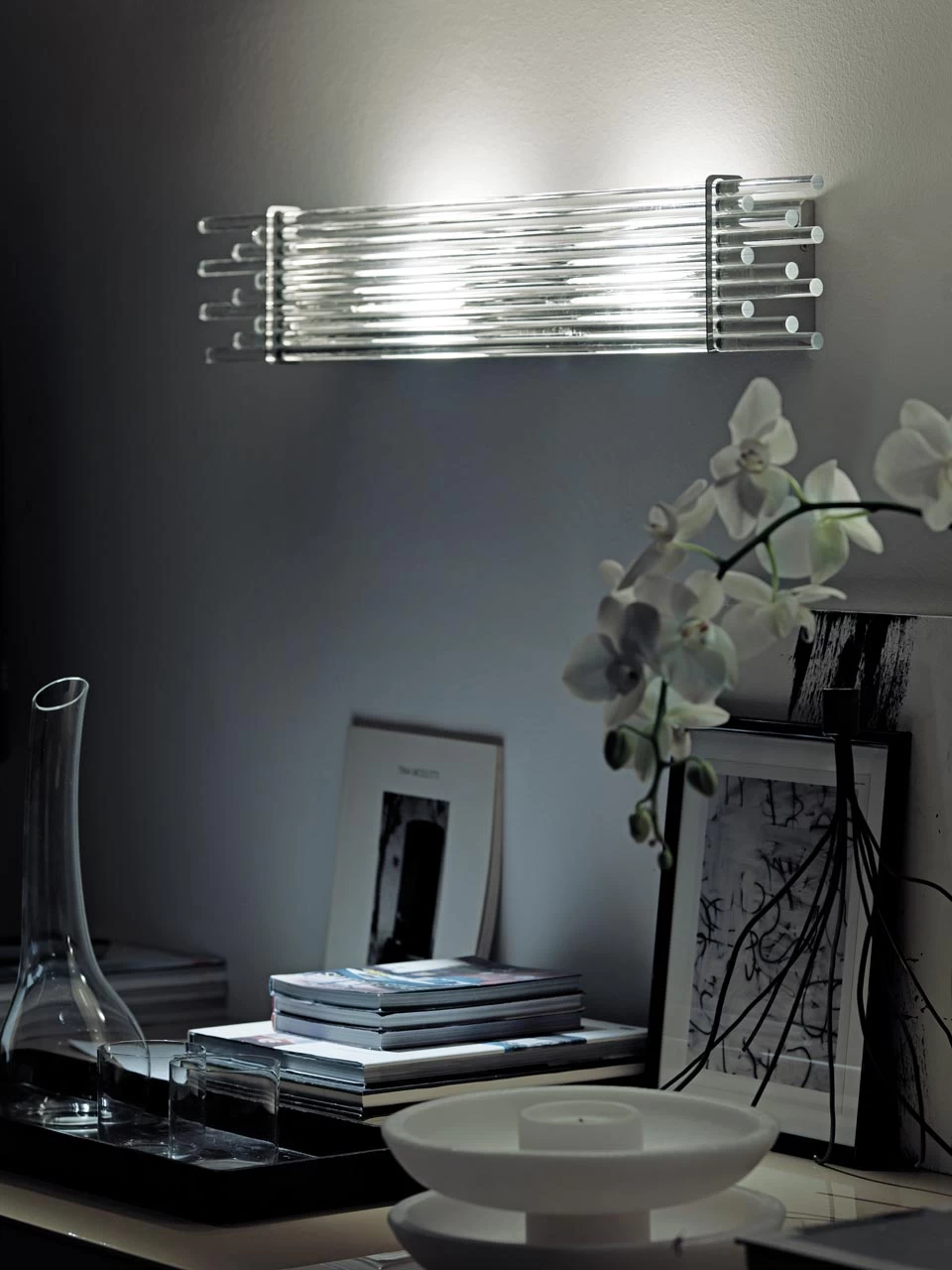 Cette longue applique de la collection Diadema, en verre de Murano soufflé bouche transparent, est composée de plusieurs alignements horizontaux juxtaposés de tubes de longueurs différentes, tels des tiges en verre, laissant deviner les pièces métalliques en acier chromé qui les enserrent. Le support créé pour cette collection, qui est une innovation conçue par Romani et Saccani pour Vistosi, est également en acier chromé. Ce luminaire reflète et transmet la lumière tout en donnant une impression de mouvement grâce aux différentes tailles de tubes. L’ensemble compose une création unique de très haute qualité, et est réalisé à la main par des artisans expérimentés dans les ateliers Vistosi, un des plus grands verriers italiens, établi à Murano, près de Venise.