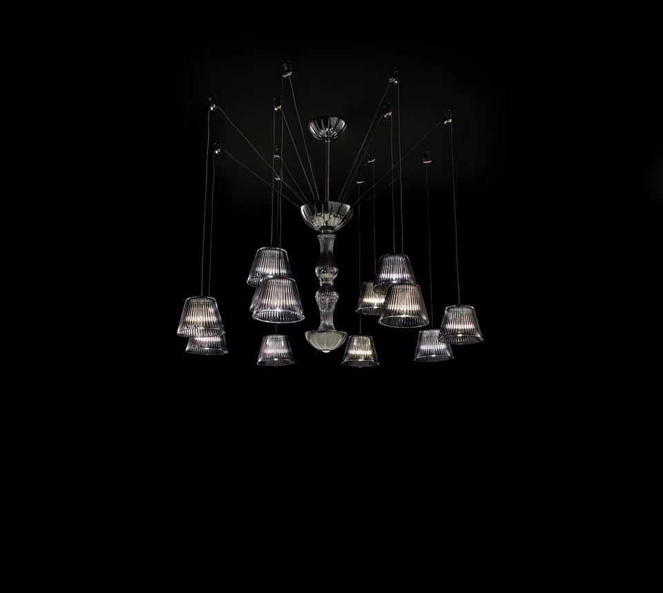 Superbe lustre tout en jeu de suspension, avec ses 12 lumières chacune suspendu à un fil qui passe dans une boucle métallique au plafond pour crée un réseau arachnéen, dans lequel délicats les abat-jours en cristal taillé et cannelé on tout à fait leur place. Ceux-ci sont suspendus autour d’une structure de métal chromé et de cristal travaillé de manière similaire aux abat-jours, formant ainsi comme la tête d’une cascade de cristal qui pourrait sortir de Versailles. Le travail du cristal, matériau plus dense que le verre, témoigne d’une grande dextérité dans la technique.