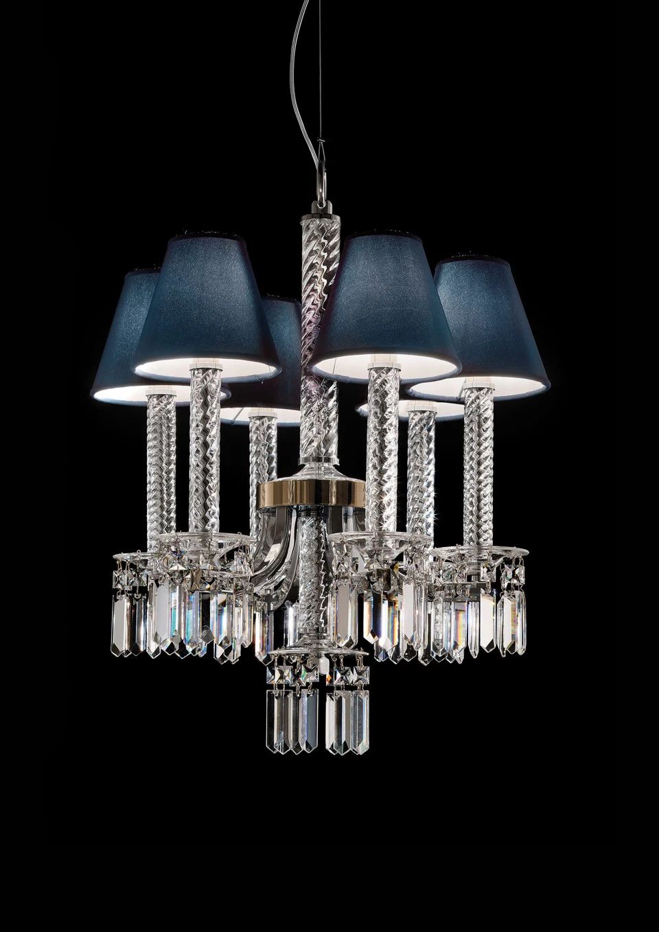 Une ligne contemporaine pour ce lustre 6 lumières orné de pampilles en cristal. Les 6 bras courbes et ramassés sont en métal chromé et le cœur du lustre en métal légèrement doré. Les fourreaux et les bassins sont en cristal magnifiquement sculpté et coiffés de petits abat-jour en tissu bleu marine. Des pampilles en cristal taillé Swarovski reflètent la lumière et se parent de mille feux. Ce lustre peut être réalisé en différentes tailles, nous consulter. Les abat-jour peuvent être choisi ivoire ou chocolat sur simple demande, à préciser sur le bordereau de commande. Ce lustre est entièrement fabriqué à la main par des maître verriers, en Italie.