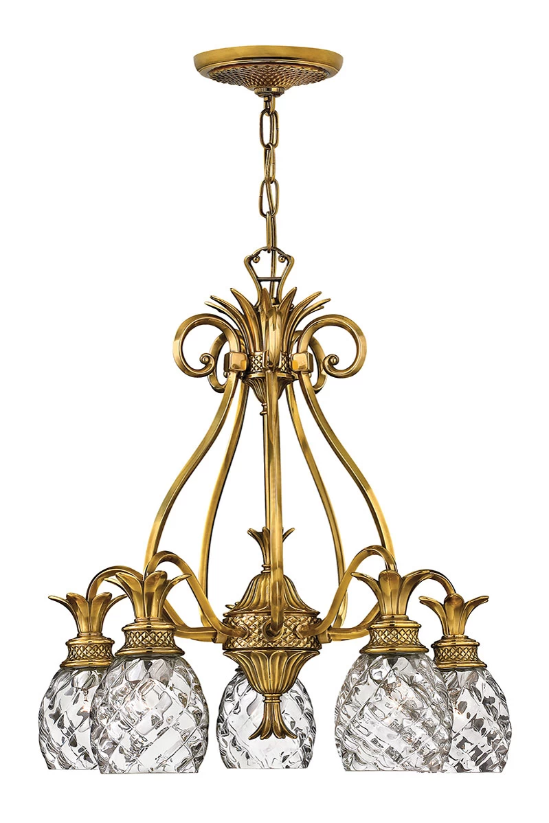 Magnifique lustre exotique 5 lumières doré issu de la collection Plantation dessiné dans un style Art Nouveau et inspiré de la texture et de la géométrie de l’ananas, le lustre est tout de métal finition laiton bruni et verre optique. Le modèle est composé d’un superbe enfilage dont chaque détail rappelle le fruit qui inspire l’esthétique du lustre, il est doté de 5 bras en col de cygne sur lesquels sont fixés les diffuseurs en verre optique dont le motif en losange géométrique imite celui de la peau de l’ananas, tout comme la couronne dorée qui les coiffe. L’enfilage est relié par de beaux volutes au fut, lui-même suspendu par une chaine dorée au support de plafond rond lui aussi moulé d’un motif géométrique en losange. L’ensemble est travaillé d’une finition laiton bruni qui donne toute sa superbe au lustre. L’impeccable fabrication est celle de la maison britannique Elstead lighting, connue depuis le XVIIème siècle comme les forges Elstead, aujourd’hui alliant la perpétuation des techniques artisanales à une véritable modernité dans le design et la réalisation. La collection comprend également une suspension 1 lumière sous la référence 22100280, un plafonnier disponible en petit et grand modèle sous les références 22100281 et 22100282 et une applique sous la référence 22100283.