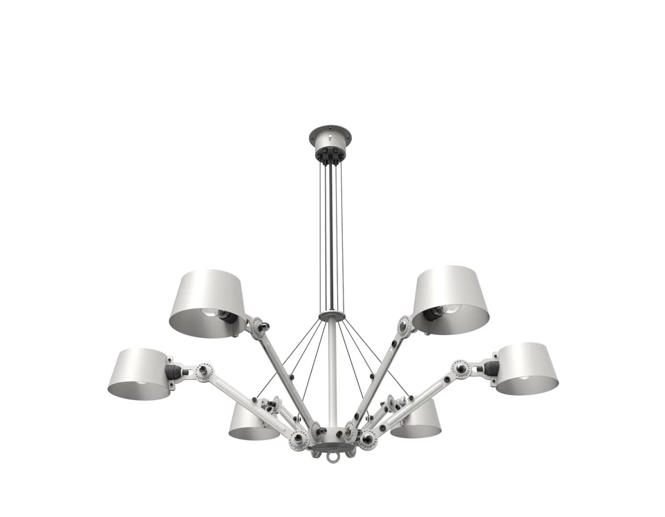 Le lustre Bolt réunit 6 réflecteurs Bolt, le grand classique de Tonone, en un lustre à 6 branches. On retrouve toutes les caratéristiques des produits Tonone: les support en acier massif (10 kg au total!), le revêtement mat thermo-laqué qui assure une finition et une durabilité impeccables, les abat-jours en aluminium, et une conception fouillée qui s’inspire des mécanismes industriels. Chacun des six bras est soutenu par un hauban ajustable, ce qui permet d’ajuster chacune des lampes en hauteur et orientation par deux rotules réglables. Il est donc possible d’orienter les bras vers le haut, vers le bas ou horizontalement pour augmenter la portée, ainsi que la direction de l’éclairage de chaque lampe. Ce lustre, présenté ici en gris clair, est disponible dans chacune des 7 couleurs classiques de Tonone: noir, blanc pur, crème (lightning white), gris clair, khaki, orange et bleu (références de 17090192 à 17090198).