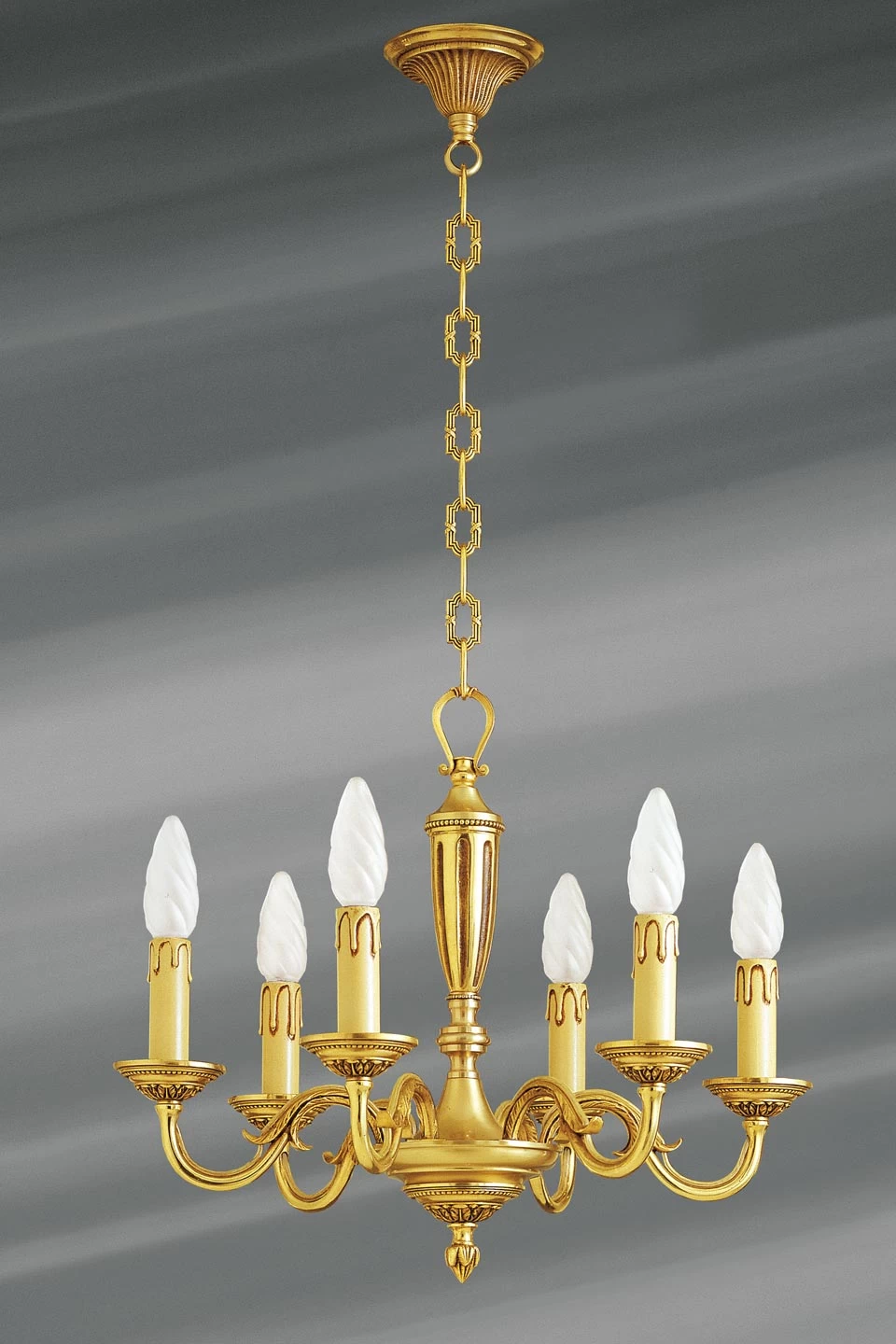 Finesse et légèreté pour ce très joli lustre en bronze massif doré de style Louis XVI, arborant six lumières au bout de ses bras en double volutes recouverts de feuilles d’acanthe recourbées. Les bassins qui portent bougies sont évasés en forme de coupelles très travaillées recouvertes de petites feuilles et soulignées de fines perles. Il se termine par un bourgeon floral surmonté d’une partie en forme de coupe élégante reprenant les motifs des bassins. Son corps fin et délicat s’élance en une forme allongée et cannelée surlignée elle aussi par un fin collier perlé. Son maillon d’attache en forme de lyre, ses maillons de chaîne, plats, cannelés et toriques et son cabochon au décor cannelé témoignent du soin extrême dont ce lustre a fait l’objet jusque dans ses moindres détails. Il est le fruit du travail entièrement manuel et exceptionnel des artisans de la maison Lucien Gau, fournisseurs officiels des monuments historiques et châteaux de France et des plus grands palaces de ce monde. Avec 88 cm de hauteur sous chaîne, ce lustre sera mis en valeur dans une pièce d’environ 3 mètres de hauteur sous plafond. Il existe cependant des modèles de plus petites dimensions, en cinq lumières, ou en trois lumières visible sous la référence 16060065. Vous pourrez également regarder les appliques assorties à une lumière sous la référence 1606062 ou à deux lumières visible sous la référence 16060063.