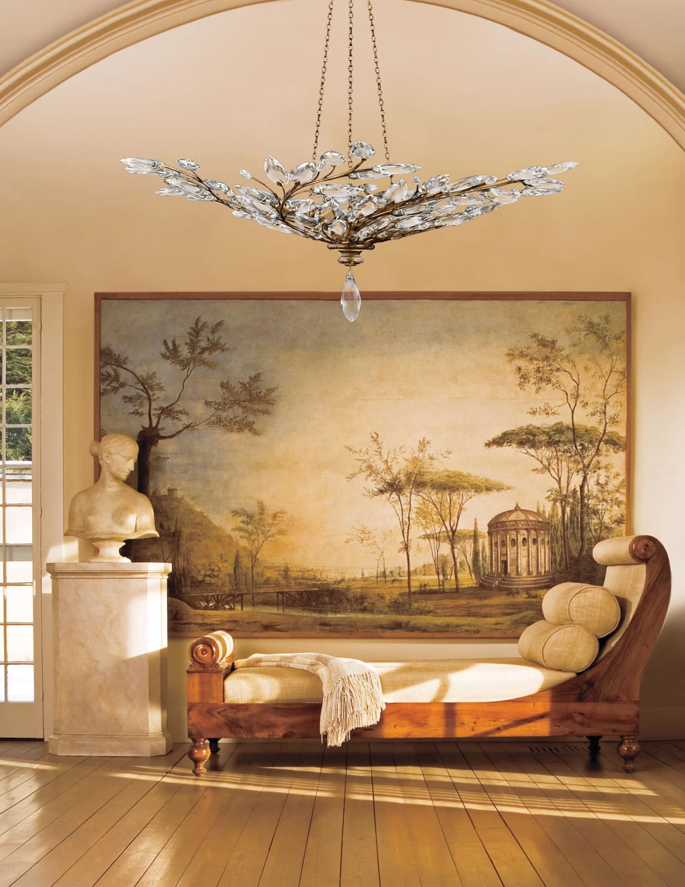 Ce très beau et poétique lustre de cristal en bouquet de branchages vieil or appartient à la collection Crystal Laurel de Fine Art Lamps. Dans un mouvement particulièrement gracieux, de nombreux cristaux taillés et montés en feuille sont placés à l’extrémité de branchages décorés à la feuille d’or et enroulé autour de l’axe central. L’ensemble est suspendu par trois chaînettes à un socle de plafond circulaire et décoré d’une boule. Une unique pampille centrale, placée à la base de ce lustre, en complète l’équilibre et le mouvement. Ce lustre est également disponible en version décorée à la feuille d’argent, à choisir parmi les options de commande ci-dessous. La lumière produite par six ampoules placées au cœur du bouquet de reflète dans les innombrables facettes de ce magnifique luminaire. Fabriqués aux USA dans les ateliers de Fine Art Lamps